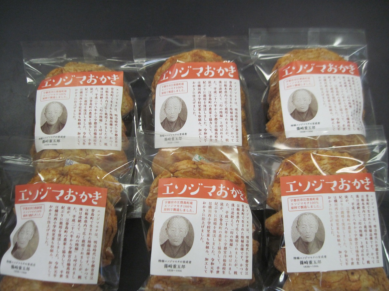 栃木県はかつて全国的に有名な陸稲の生産地でした。陸稲は、せんべいやおかきの原料となります。かつては用水路が整備されていない高台の宇都宮市内の畑などでは、米の代わりに陸稲が盛んに栽培されていました。この陸稲栽培に貢献した篤農家が、明治時代に現在の宇都宮市江曽島で農業を営んでいた篠崎重五郎です。この農家は、陸稲の種の選抜を繰り返し、収量が多い陸稲をエソジマモチと名前を付け、地域に広め、地域農業の発展に貢献しました。その後、昭和30年代に入り、江曽島地域では、都市化が進み、陸稲の栽培は衰退し、現在では栽培している農家はいなくなり、地域から姿を消し、幻の陸稲となってしまいました。 そこで、2016年に本校で教鞭を取っていた橋本智先生が、独立行政法人・農業生物資源研究より、この陸稲の種があることを調べ、取り寄せ、生徒たちと栽培を始め、再び地域に復活させようとプロジェクト活動を始めました。その後、後輩たちはこの種を大切に引継ぎ、少しずつ種を増やしていきました。そして2017年には、地域の農家さんと協働でエソジマモチ作りが始まり、この年の秋、地元にエソジマモチを復活させることができました。 その後、農家さんたちは、エソジマモチの保存会を立ち上げ、この陸稲を大切に守り伝えています。生徒たちは、先輩からのこのプロジェクトを引継ぎ、後世に伝承するため、地元の小学校にエソジマモチの紹介をするための出前授業を開始しました。この取組は現在も継続しています。また、農家さんの畑にエソジマモチの種まきのボランティアや小学生と共に農家さんのエソジマモチ畑の稲刈りなどの活動を継続して行っています。その後、地元の米菓店がこのエソジマモチで、おかきを製造しています。そのおかきを地域のイベントや学校祭などで生徒たちは販売などを行い、エソジマモチを利用した地域活性化に貢献をしています。
