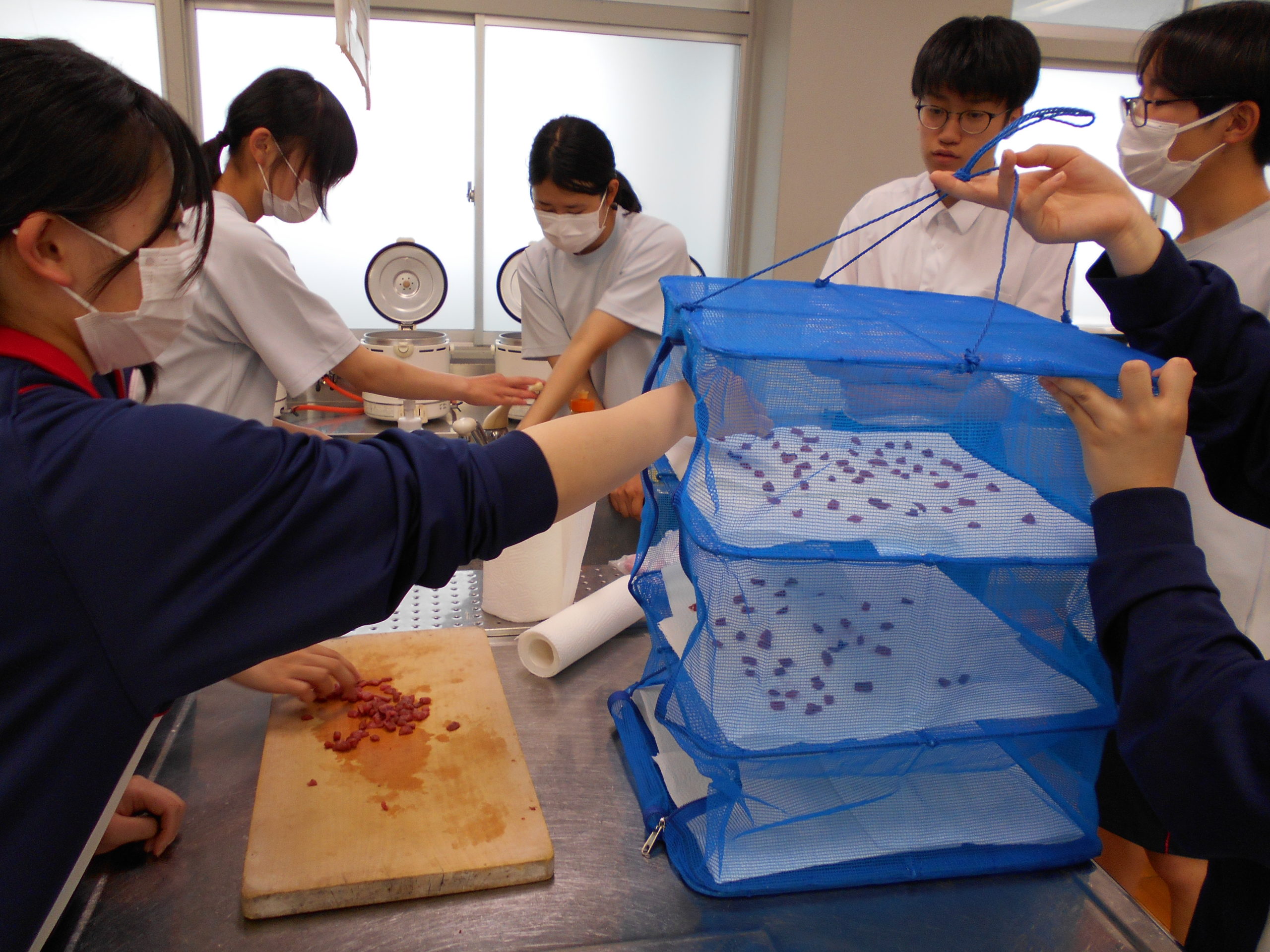 芋茎を生から調理し、味付けや乾燥の期間を変えて試行錯誤したが、その過程で大失敗も経験した。きれいな朱色の「すこ」が、突然カビのような緑色に変色したこともあった(アントシアニンが酸性からアルカリ性に傾くと変色することも知った)。5ヶ月かけて納得のいく「すこスコーン」が完成し、県内のイベントで販売できるようになった。地域のお年寄り、卒業生から大きな反響があり、今後の発展策に期待できると感じた。