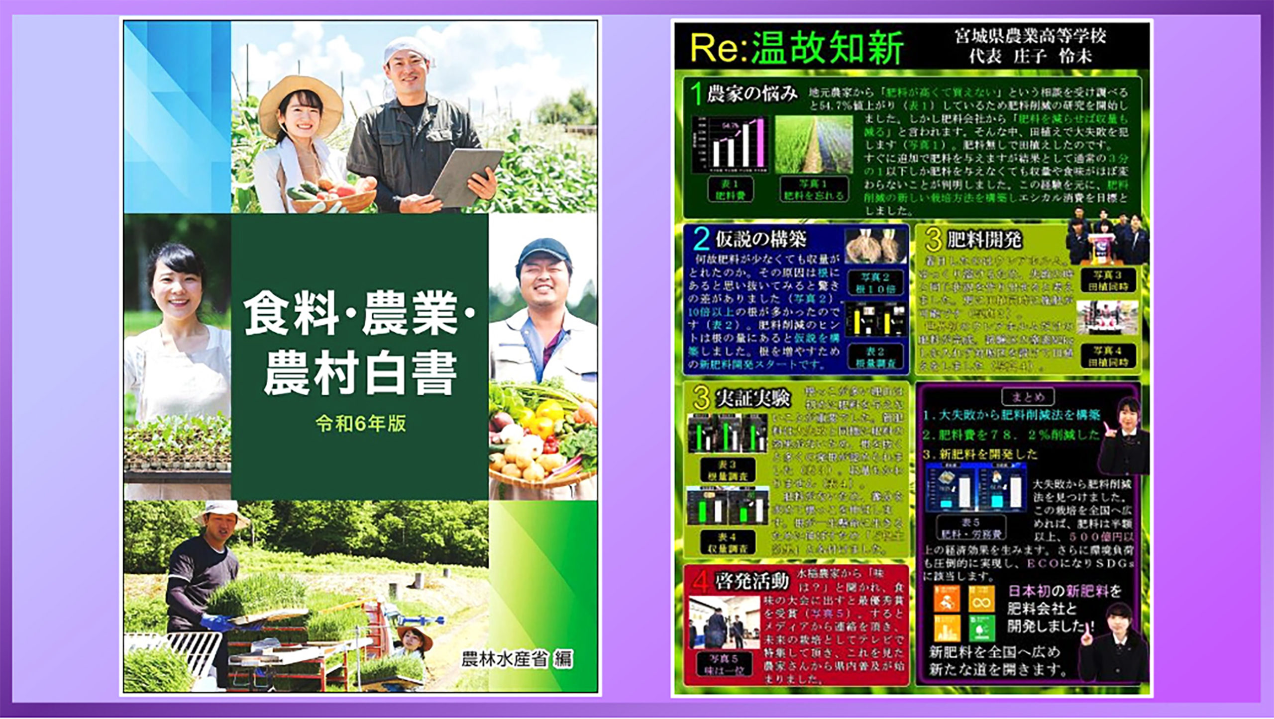 何度も失敗を繰り返した末に完成したのが「Re:温故知新」です。旧来の肥料6kgに対し、新肥料2kgで同等の収量を実現し、根は1.4倍に伸び、味は最高値を記録しました。専門家からも「稲作を変える新しい肥料」と高い評価を得ました。特許も出願し、肥料メーカーと全国商品化を進めています。導入すれば肥料費は78%削減、労務費も62%減となり、農業法人は年間300万円の利益増につながります。
