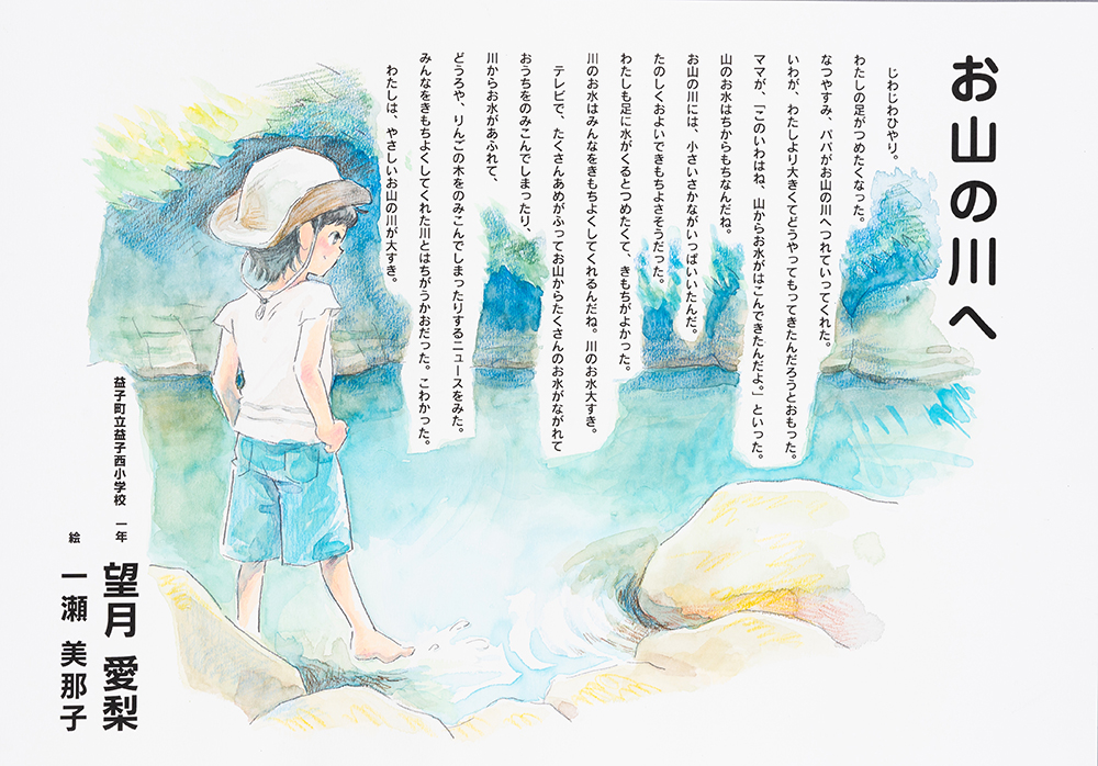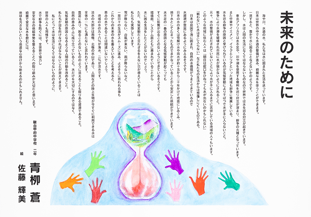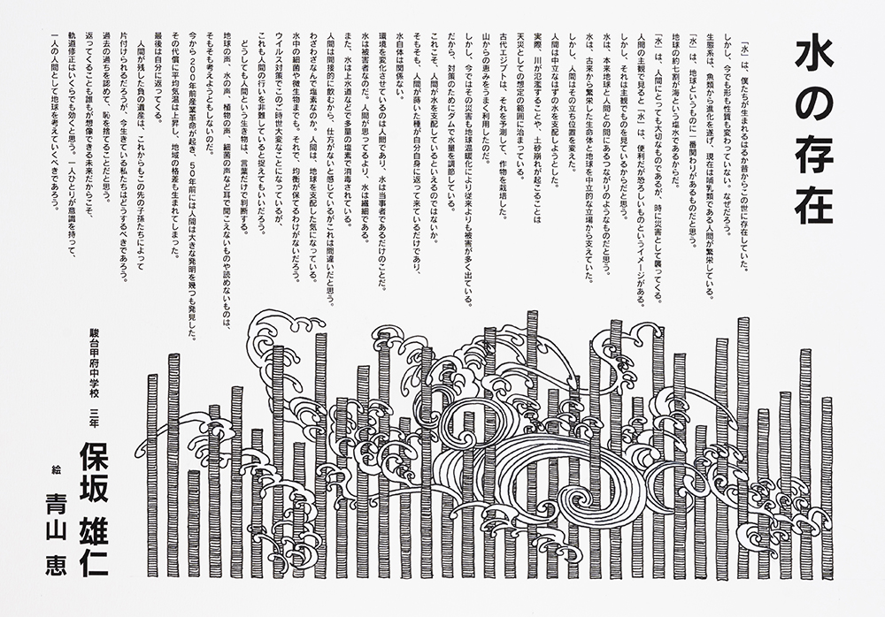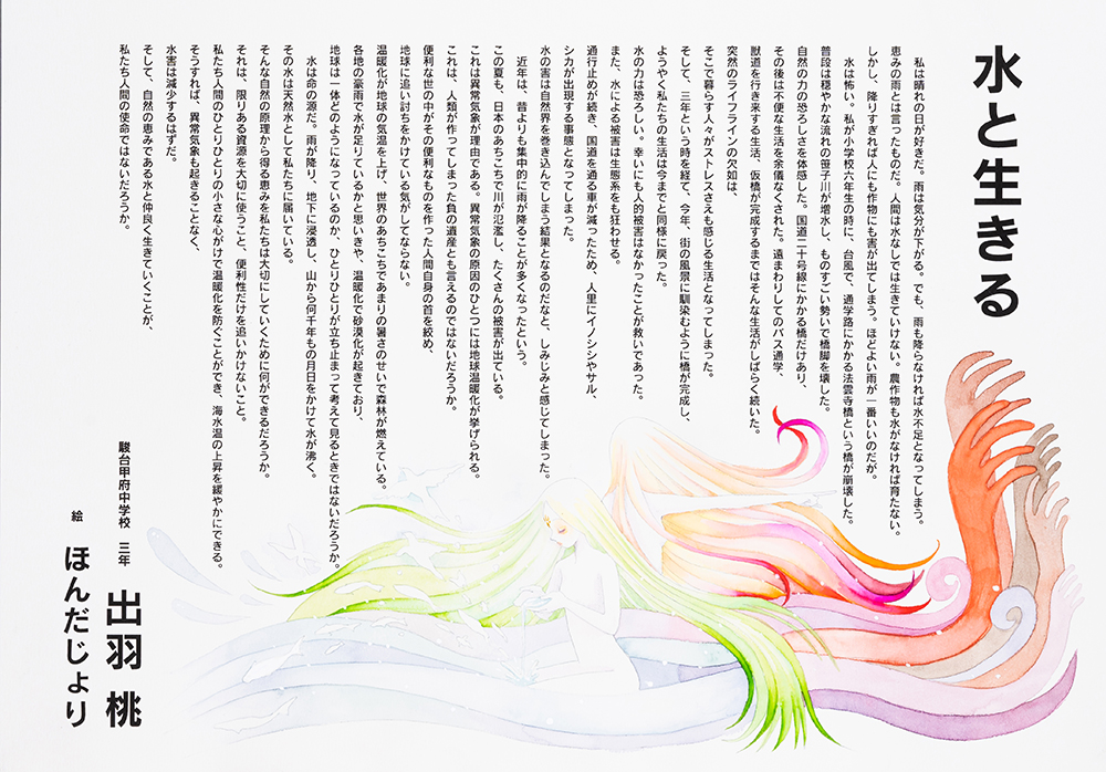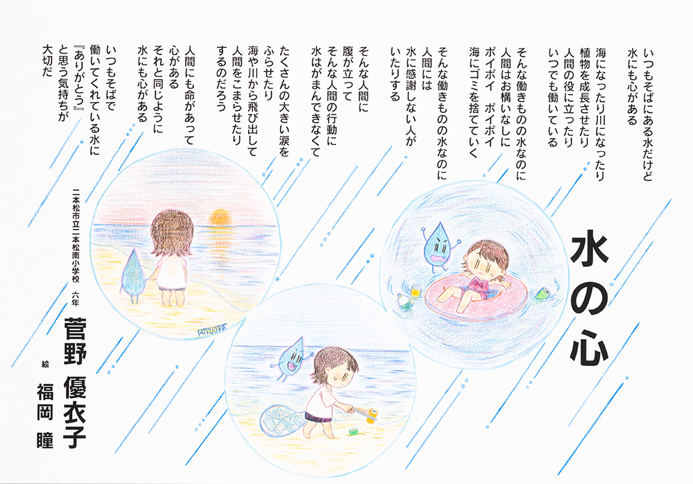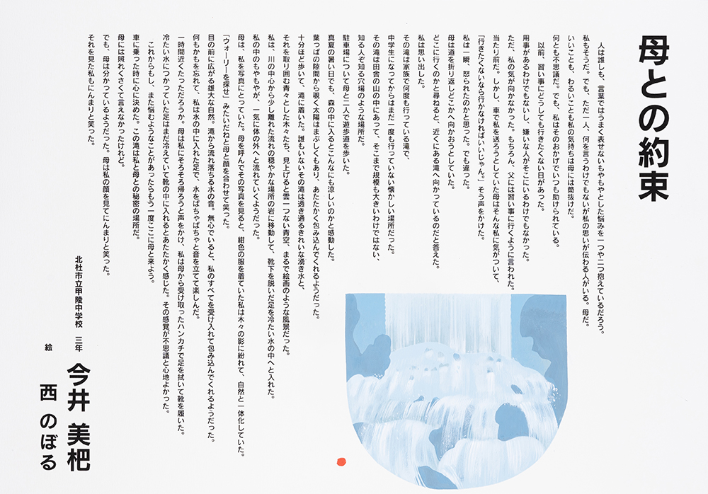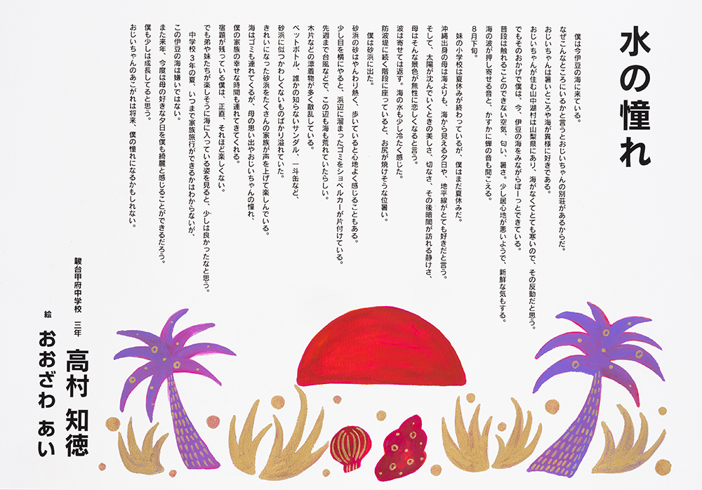 AWARD ざぶん賞 受賞作品 第20回(2022年度) ざぶん賞 受賞作品 大賞 ざぶん大賞 「母との約束」 今井美杷 (北杜市立甲陵中学校3年) 絵:西のぼる 大臣賞・長官賞・地方自治体特別賞 国土交通大臣賞 「水の憧れ」 高村知徳 (駿台甲府中学校3年) 絵:おおざわあい 文部科学大臣賞 「神の水」 宮島諒 (印西市立木刈中学校1年) 絵:市村淳一 環境大臣賞 「飛騨川百面相」 馬場貴大 (川辺町立川辺中学校2年) 絵:百鬼丸 水産庁長官賞 「西浦マーケット」 尾崎安吾 (蒲郡市立西浦小学校6年) 絵:damaco 海上保安庁長官賞 「うみのはなし」 髙松瑞生 (益子町立益子西小学校1年) 絵:miiya 審査委員長特別賞・準大賞 檀太郎審査員特別賞 「水と生きる」 出羽桃 (駿台甲府中学校3年) 絵:ほんだじょり 檀晴子審査員特別賞 「笑顔を生むために」 上村藍 (北杜市立甲陵中学校3年) 絵:さぶさちえ 準大賞 「青いうみとお兄さん」 渡邉朝比 (益子町立益子西小学校2年) 絵:高橋汽章 準大賞 「海の宝物」 西山和葉 (兵庫教育大学附属中学校3年) 絵:さきもとあきのぶ 準大賞 「土しゃくずれ」 はらだえいた (坂井市立春江西小学校2年) 絵:KONIROW 準大賞 「水の旅人」 佐久間明歩 (二本松市立二本松南小学校6年) 絵:松江比佐子 ざぶん環境賞・ざぶん文化賞 文化賞 「じいじと海」 荒屋知咲登 (白山市立美川中学校1年) 絵:原田リカ 文化賞 「お山の川へ」 望月愛梨 (益子町立益子西小学校1年) 絵:一瀬美那子 文化賞 「水泳」 久保薗正道 (さつま町立佐志小学校3年) 絵:梅村万里子 文化賞 「みずはめぐり続ける」 大貫瑛土 (宇都宮市立城山西小学校6年) 絵:矢野公子 文化賞 「昔々の鰻のお話」 根津琴子 (駿台甲府中学校2年) 絵:小島尚子 文化賞 「雨の日」 藤井釉菜 (北杜市立甲陵中学校3年) 絵:子大人(cotona) 文化賞 「水と傘」 進藤 月 (北杜市立甲陵中学校3年) 絵:シノダタクヤ 文化賞 「水の心」 菅野優衣子 (二本松市立二本松南小学校6年) 絵:福岡 瞳 文化賞 「失われつつある海岸」 平澤花香 (駿台甲府中学校1年) 絵:Juli 文化賞 「楽しいプール」 堤カレン (八女市立八幡小学校4年) 絵:おおざわあい 環境賞 「海を守るために私たちにできること」 横山大悟 (駿台甲府中学校2年) 絵:山崎たかし 環境賞 「分かち合う水」 垣川達頼 (文京区立金富小学校6年) 絵:饅頭VERY MUCH 環境賞 「私の好きな水」 野口京子 (駿台甲府中学校1年) 絵:浅見祥子 環境賞 「水の大切さ」 栁本悠輝 (北杜市立甲陵中学校3年) 絵:一二明子 環境賞 「水の存在」 保坂雄仁 (駿台甲府中学校3年) 絵:青山恵 環境賞 「未来のために」 青栁蒼 (駿台甲府中学校2年) 絵:佐藤輝美 環境賞 「イルカと環境問題」 木村暖 (印西市立木刈中学校1年) 絵:front52dx 環境賞 「水の環境」 千須和朋希 (駿台甲府中学校2年) 絵:ZIGSAWのにしだ 環境賞 「水の大切さと生き物の気持ちを考える」 平野惠太郎 (筑波大学附属小学校6年) 絵:小林 隆則 ざぶん賞招待 ざぶん賞招待 「水たまり」 福田春馬 (石川県立盲学校小6) 絵:市村淳一 ざぶん賞招待 「水の詩」 小菅翔栄 (栃木県立聾学校 中2) 絵:市村淳一 ざぶん賞招待 「海と生き物」 鈴木隼 (栃木県立盲学校 小4) 絵:五味渕一彦 ざぶん賞招待 「川遊び」 池田瑚々実 (栃木県立盲学校 小3) 絵:林香君