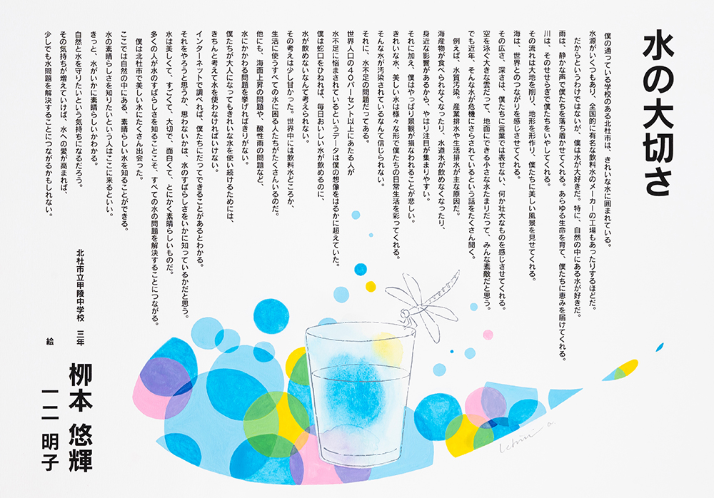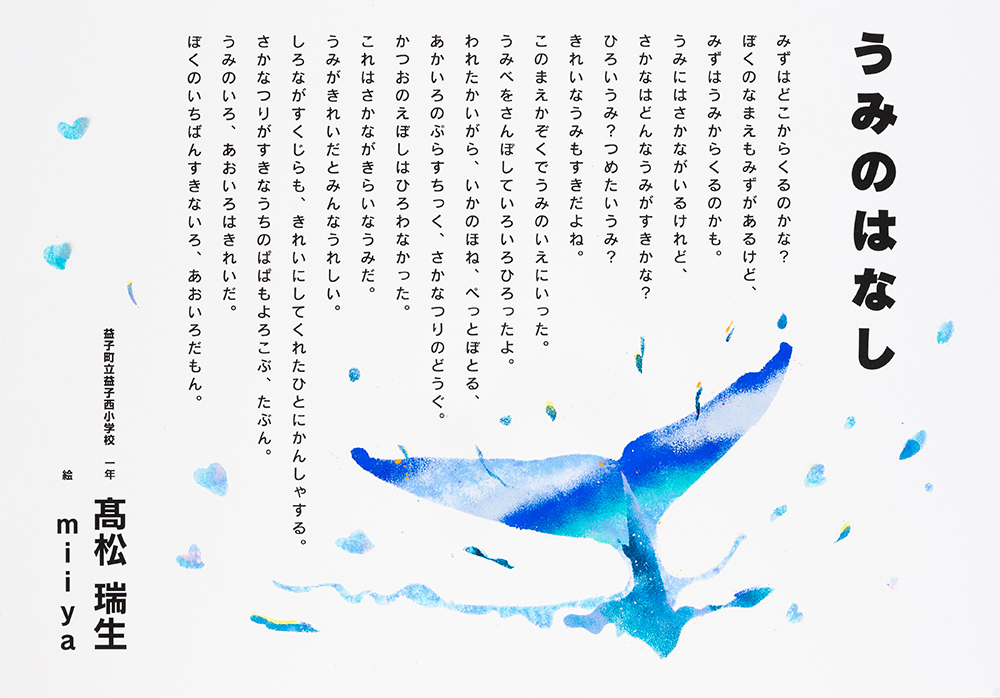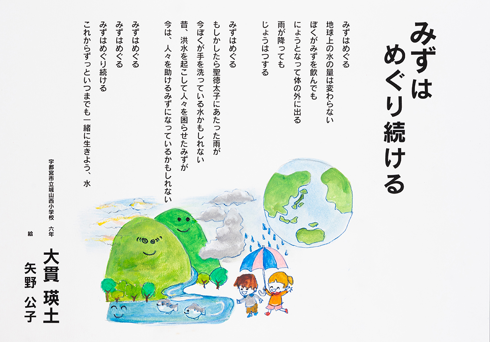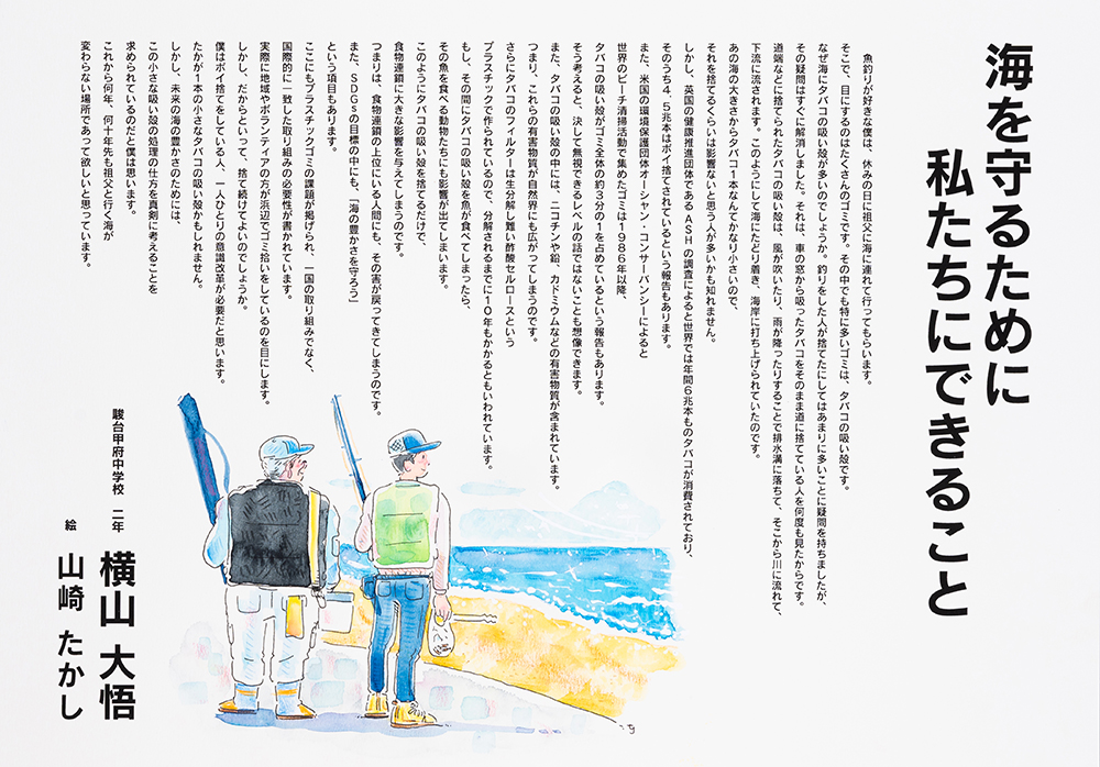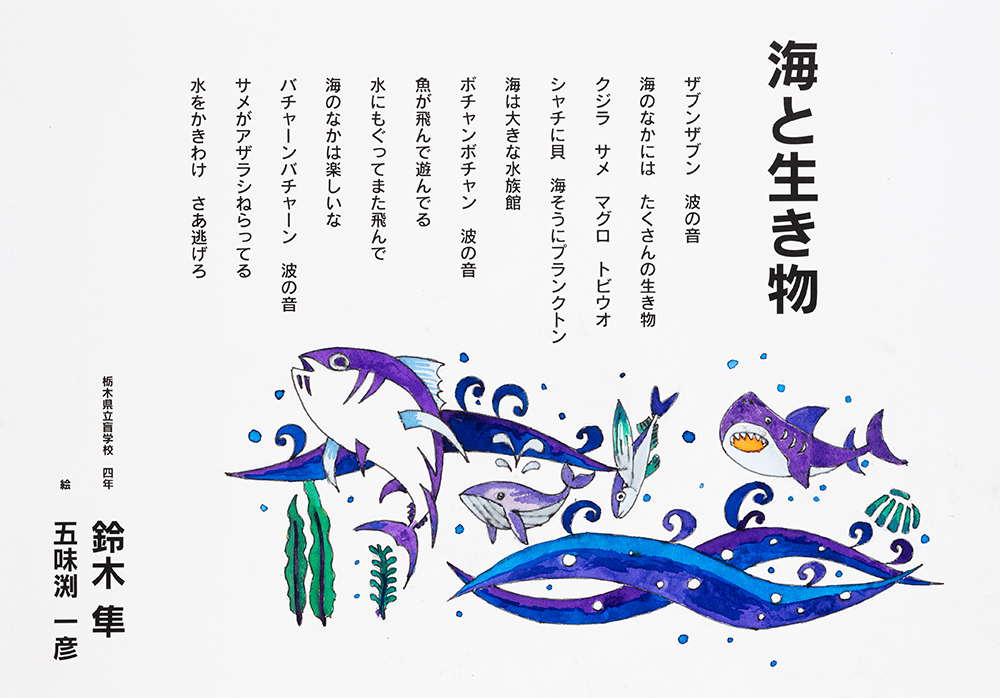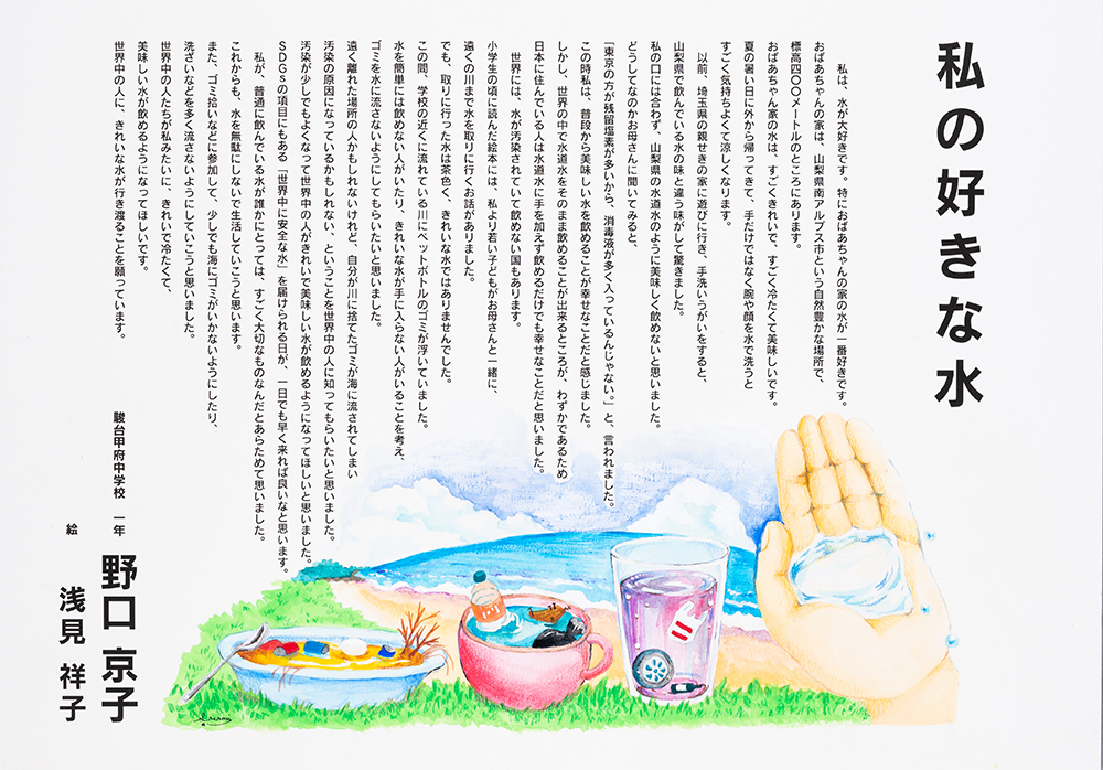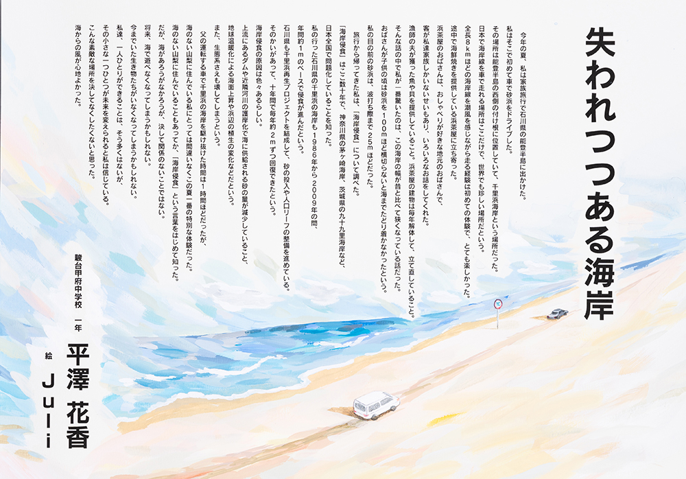 AWARD ざぶん賞 受賞作品 第20回(2022年度) ざぶん賞 受賞作品 大賞 ざぶん大賞 「母との約束」 今井美杷 (北杜市立甲陵中学校3年) 絵:西のぼる 大臣賞・長官賞・地方自治体特別賞 国土交通大臣賞 「水の憧れ」 高村知徳 (駿台甲府中学校3年) 絵:おおざわあい 文部科学大臣賞 「神の水」 宮島諒 (印西市立木刈中学校1年) 絵:市村淳一 環境大臣賞 「飛騨川百面相」 馬場貴大 (川辺町立川辺中学校2年) 絵:百鬼丸 水産庁長官賞 「西浦マーケット」 尾崎安吾 (蒲郡市立西浦小学校6年) 絵:damaco 海上保安庁長官賞 「うみのはなし」 髙松瑞生 (益子町立益子西小学校1年) 絵:miiya 審査委員長特別賞・準大賞 檀太郎審査員特別賞 「水と生きる」 出羽桃 (駿台甲府中学校3年) 絵:ほんだじょり 檀晴子審査員特別賞 「笑顔を生むために」 上村藍 (北杜市立甲陵中学校3年) 絵:さぶさちえ 準大賞 「青いうみとお兄さん」 渡邉朝比 (益子町立益子西小学校2年) 絵:高橋汽章 準大賞 「海の宝物」 西山和葉 (兵庫教育大学附属中学校3年) 絵:さきもとあきのぶ 準大賞 「土しゃくずれ」 はらだえいた (坂井市立春江西小学校2年) 絵:KONIROW 準大賞 「水の旅人」 佐久間明歩 (二本松市立二本松南小学校6年) 絵:松江比佐子 ざぶん環境賞・ざぶん文化賞 文化賞 「じいじと海」 荒屋知咲登 (白山市立美川中学校1年) 絵:原田リカ 文化賞 「お山の川へ」 望月愛梨 (益子町立益子西小学校1年) 絵:一瀬美那子 文化賞 「水泳」 久保薗正道 (さつま町立佐志小学校3年) 絵:梅村万里子 文化賞 「みずはめぐり続ける」 大貫瑛土 (宇都宮市立城山西小学校6年) 絵:矢野公子 文化賞 「昔々の鰻のお話」 根津琴子 (駿台甲府中学校2年) 絵:小島尚子 文化賞 「雨の日」 藤井釉菜 (北杜市立甲陵中学校3年) 絵:子大人(cotona) 文化賞 「水と傘」 進藤 月 (北杜市立甲陵中学校3年) 絵:シノダタクヤ 文化賞 「水の心」 菅野優衣子 (二本松市立二本松南小学校6年) 絵:福岡 瞳 文化賞 「失われつつある海岸」 平澤花香 (駿台甲府中学校1年) 絵:Juli 文化賞 「楽しいプール」 堤カレン (八女市立八幡小学校4年) 絵:おおざわあい 環境賞 「海を守るために私たちにできること」 横山大悟 (駿台甲府中学校2年) 絵:山崎たかし 環境賞 「分かち合う水」 垣川達頼 (文京区立金富小学校6年) 絵:饅頭VERY MUCH 環境賞 「私の好きな水」 野口京子 (駿台甲府中学校1年) 絵:浅見祥子 環境賞 「水の大切さ」 栁本悠輝 (北杜市立甲陵中学校3年) 絵:一二明子 環境賞 「水の存在」 保坂雄仁 (駿台甲府中学校3年) 絵:青山恵 環境賞 「未来のために」 青栁蒼 (駿台甲府中学校2年) 絵:佐藤輝美 環境賞 「イルカと環境問題」 木村暖 (印西市立木刈中学校1年) 絵:front52dx 環境賞 「水の環境」 千須和朋希 (駿台甲府中学校2年) 絵:ZIGSAWのにしだ 環境賞 「水の大切さと生き物の気持ちを考える」 平野惠太郎 (筑波大学附属小学校6年) 絵:小林 隆則 ざぶん賞招待 ざぶん賞招待 「水たまり」 福田春馬 (石川県立盲学校小6) 絵:市村淳一 ざぶん賞招待 「水の詩」 小菅翔栄 (栃木県立聾学校 中2) 絵:市村淳一 ざぶん賞招待 「海と生き物」 鈴木隼 (栃木県立盲学校 小4) 絵:五味渕一彦 ざぶん賞招待 「川遊び」 池田瑚々実 (栃木県立盲学校 小3) 絵:林香君