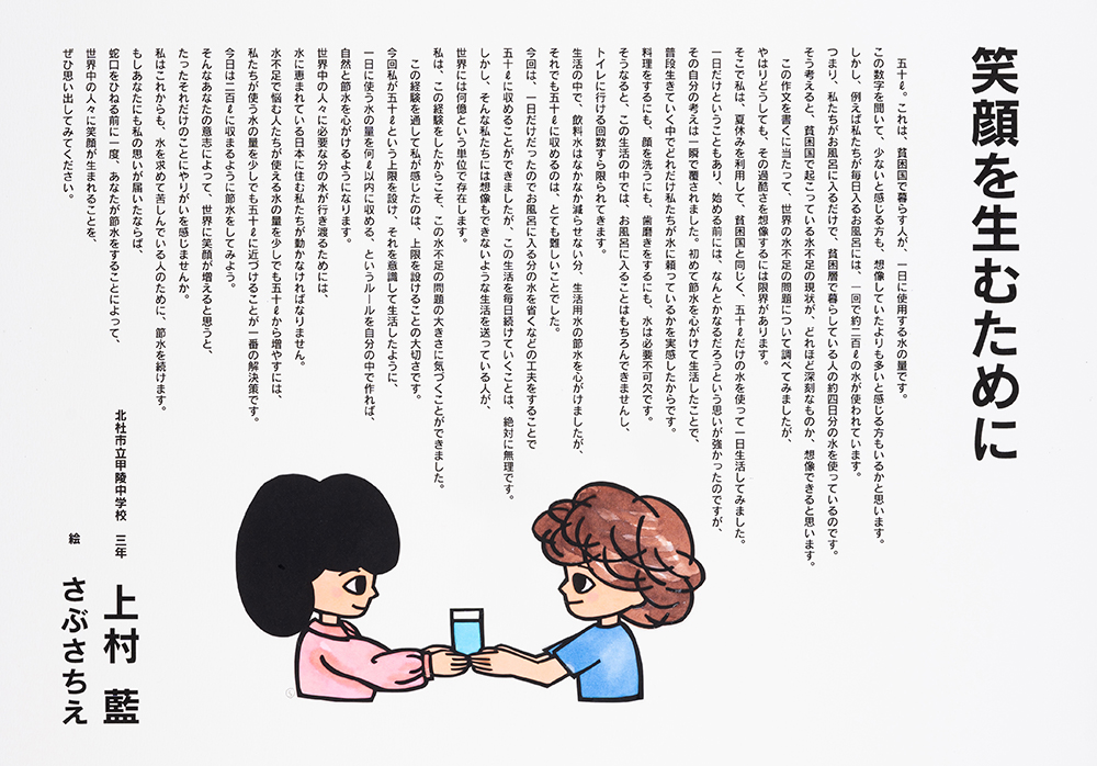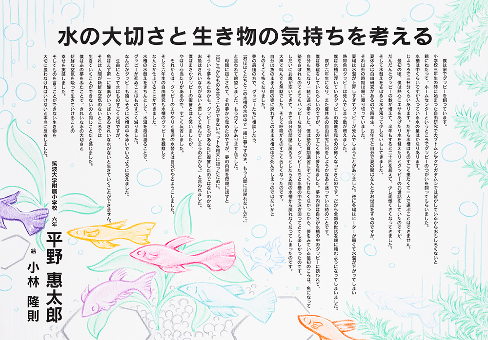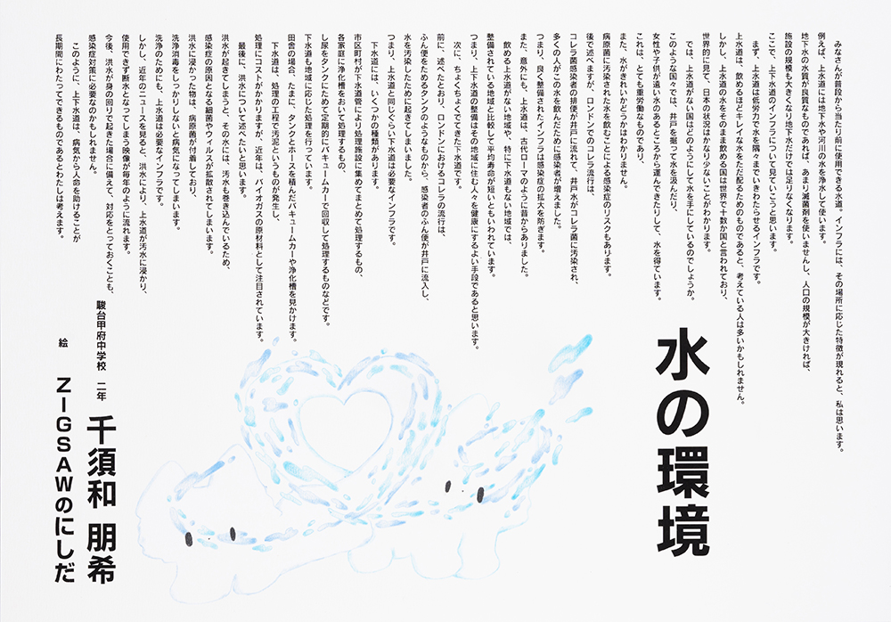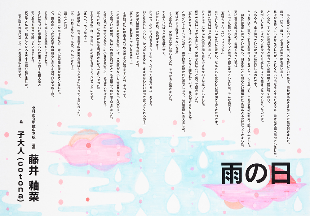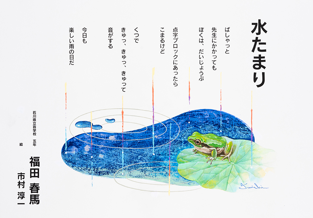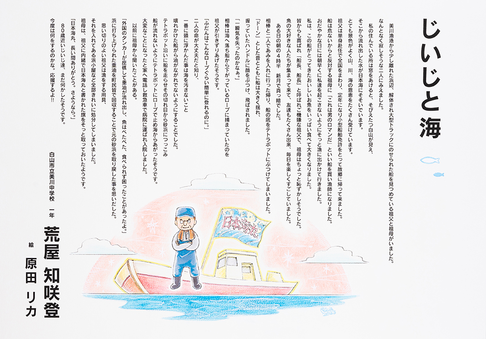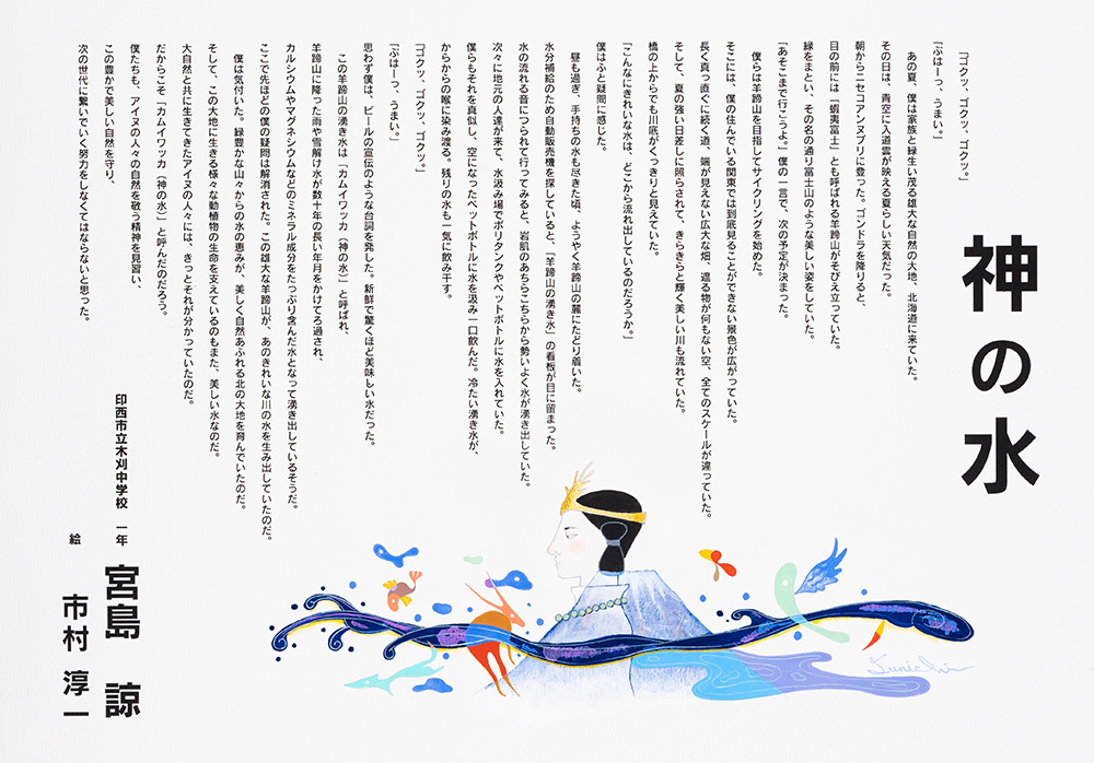 AWARD ざぶん賞 受賞作品 第20回(2022年度) ざぶん賞 受賞作品 大賞 ざぶん大賞 「母との約束」 今井美杷 (北杜市立甲陵中学校3年) 絵:西のぼる 大臣賞・長官賞・地方自治体特別賞 国土交通大臣賞 「水の憧れ」 高村知徳 (駿台甲府中学校3年) 絵:おおざわあい 文部科学大臣賞 「神の水」 宮島諒 (印西市立木刈中学校1年) 絵:市村淳一 環境大臣賞 「飛騨川百面相」 馬場貴大 (川辺町立川辺中学校2年) 絵:百鬼丸 水産庁長官賞 「西浦マーケット」 尾崎安吾 (蒲郡市立西浦小学校6年) 絵:damaco 海上保安庁長官賞 「うみのはなし」 髙松瑞生 (益子町立益子西小学校1年) 絵:miiya 審査委員長特別賞・準大賞 檀太郎審査員特別賞 「水と生きる」 出羽桃 (駿台甲府中学校3年) 絵:ほんだじょり 檀晴子審査員特別賞 「笑顔を生むために」 上村藍 (北杜市立甲陵中学校3年) 絵:さぶさちえ 準大賞 「青いうみとお兄さん」 渡邉朝比 (益子町立益子西小学校2年) 絵:高橋汽章 準大賞 「海の宝物」 西山和葉 (兵庫教育大学附属中学校3年) 絵:さきもとあきのぶ 準大賞 「土しゃくずれ」 はらだえいた (坂井市立春江西小学校2年) 絵:KONIROW 準大賞 「水の旅人」 佐久間明歩 (二本松市立二本松南小学校6年) 絵:松江比佐子 ざぶん環境賞・ざぶん文化賞 文化賞 「じいじと海」 荒屋知咲登 (白山市立美川中学校1年) 絵:原田リカ 文化賞 「お山の川へ」 望月愛梨 (益子町立益子西小学校1年) 絵:一瀬美那子 文化賞 「水泳」 久保薗正道 (さつま町立佐志小学校3年) 絵:梅村万里子 文化賞 「みずはめぐり続ける」 大貫瑛土 (宇都宮市立城山西小学校6年) 絵:矢野公子 文化賞 「昔々の鰻のお話」 根津琴子 (駿台甲府中学校2年) 絵:小島尚子 文化賞 「雨の日」 藤井釉菜 (北杜市立甲陵中学校3年) 絵:子大人(cotona) 文化賞 「水と傘」 進藤 月 (北杜市立甲陵中学校3年) 絵:シノダタクヤ 文化賞 「水の心」 菅野優衣子 (二本松市立二本松南小学校6年) 絵:福岡 瞳 文化賞 「失われつつある海岸」 平澤花香 (駿台甲府中学校1年) 絵:Juli 文化賞 「楽しいプール」 堤カレン (八女市立八幡小学校4年) 絵:おおざわあい 環境賞 「海を守るために私たちにできること」 横山大悟 (駿台甲府中学校2年) 絵:山崎たかし 環境賞 「分かち合う水」 垣川達頼 (文京区立金富小学校6年) 絵:饅頭VERY MUCH 環境賞 「私の好きな水」 野口京子 (駿台甲府中学校1年) 絵:浅見祥子 環境賞 「水の大切さ」 栁本悠輝 (北杜市立甲陵中学校3年) 絵:一二明子 環境賞 「水の存在」 保坂雄仁 (駿台甲府中学校3年) 絵:青山恵 環境賞 「未来のために」 青栁蒼 (駿台甲府中学校2年) 絵:佐藤輝美 環境賞 「イルカと環境問題」 木村暖 (印西市立木刈中学校1年) 絵:front52dx 環境賞 「水の環境」 千須和朋希 (駿台甲府中学校2年) 絵:ZIGSAWのにしだ 環境賞 「水の大切さと生き物の気持ちを考える」 平野惠太郎 (筑波大学附属小学校6年) 絵:小林 隆則 ざぶん賞招待 ざぶん賞招待 「水たまり」 福田春馬 (石川県立盲学校小6) 絵:市村淳一 ざぶん賞招待 「水の詩」 小菅翔栄 (栃木県立聾学校 中2) 絵:市村淳一 ざぶん賞招待 「海と生き物」 鈴木隼 (栃木県立盲学校 小4) 絵:五味渕一彦 ざぶん賞招待 「川遊び」 池田瑚々実 (栃木県立盲学校 小3) 絵:林香君