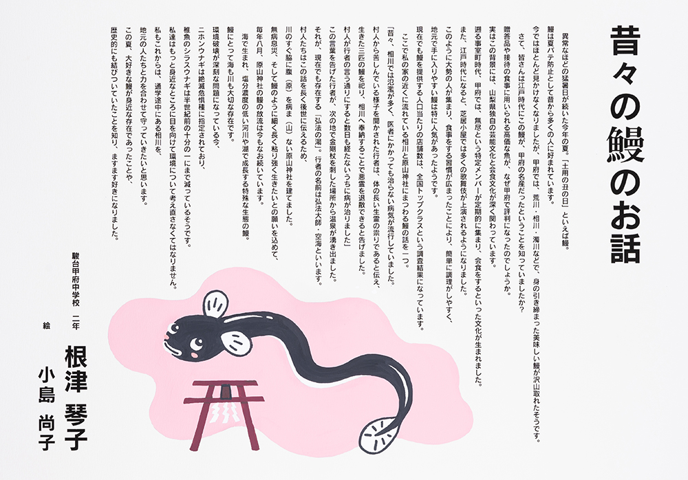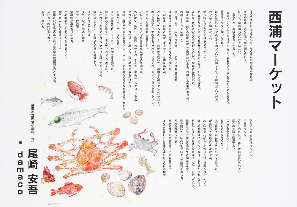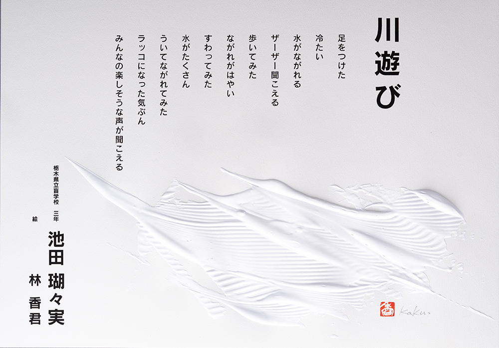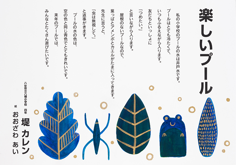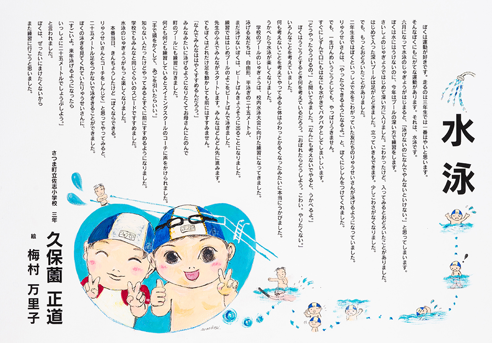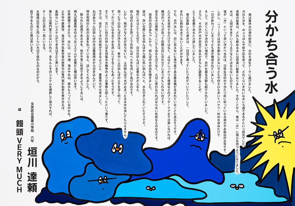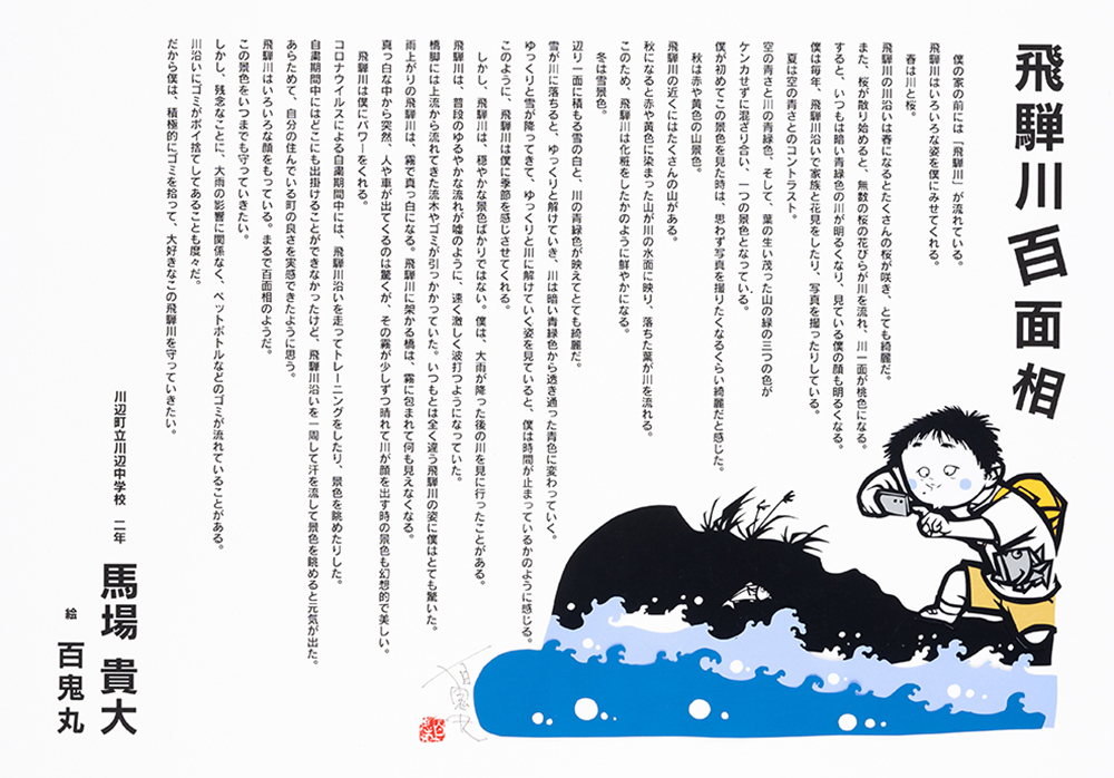 AWARD ざぶん賞 受賞作品 第20回(2022年度) ざぶん賞 受賞作品 大賞 ざぶん大賞 「母との約束」 今井美杷 (北杜市立甲陵中学校3年) 絵:西のぼる 大臣賞・長官賞・地方自治体特別賞 国土交通大臣賞 「水の憧れ」 高村知徳 (駿台甲府中学校3年) 絵:おおざわあい 文部科学大臣賞 「神の水」 宮島諒 (印西市立木刈中学校1年) 絵:市村淳一 環境大臣賞 「飛騨川百面相」 馬場貴大 (川辺町立川辺中学校2年) 絵:百鬼丸 水産庁長官賞 「西浦マーケット」 尾崎安吾 (蒲郡市立西浦小学校6年) 絵:damaco 海上保安庁長官賞 「うみのはなし」 髙松瑞生 (益子町立益子西小学校1年) 絵:miiya 審査委員長特別賞・準大賞 檀太郎審査員特別賞 「水と生きる」 出羽桃 (駿台甲府中学校3年) 絵:ほんだじょり 檀晴子審査員特別賞 「笑顔を生むために」 上村藍 (北杜市立甲陵中学校3年) 絵:さぶさちえ 準大賞 「青いうみとお兄さん」 渡邉朝比 (益子町立益子西小学校2年) 絵:高橋汽章 準大賞 「海の宝物」 西山和葉 (兵庫教育大学附属中学校3年) 絵:さきもとあきのぶ 準大賞 「土しゃくずれ」 はらだえいた (坂井市立春江西小学校2年) 絵:KONIROW 準大賞 「水の旅人」 佐久間明歩 (二本松市立二本松南小学校6年) 絵:松江比佐子 ざぶん環境賞・ざぶん文化賞 文化賞 「じいじと海」 荒屋知咲登 (白山市立美川中学校1年) 絵:原田リカ 文化賞 「お山の川へ」 望月愛梨 (益子町立益子西小学校1年) 絵:一瀬美那子 文化賞 「水泳」 久保薗正道 (さつま町立佐志小学校3年) 絵:梅村万里子 文化賞 「みずはめぐり続ける」 大貫瑛土 (宇都宮市立城山西小学校6年) 絵:矢野公子 文化賞 「昔々の鰻のお話」 根津琴子 (駿台甲府中学校2年) 絵:小島尚子 文化賞 「雨の日」 藤井釉菜 (北杜市立甲陵中学校3年) 絵:子大人(cotona) 文化賞 「水と傘」 進藤 月 (北杜市立甲陵中学校3年) 絵:シノダタクヤ 文化賞 「水の心」 菅野優衣子 (二本松市立二本松南小学校6年) 絵:福岡 瞳 文化賞 「失われつつある海岸」 平澤花香 (駿台甲府中学校1年) 絵:Juli 文化賞 「楽しいプール」 堤カレン (八女市立八幡小学校4年) 絵:おおざわあい 環境賞 「海を守るために私たちにできること」 横山大悟 (駿台甲府中学校2年) 絵:山崎たかし 環境賞 「分かち合う水」 垣川達頼 (文京区立金富小学校6年) 絵:饅頭VERY MUCH 環境賞 「私の好きな水」 野口京子 (駿台甲府中学校1年) 絵:浅見祥子 環境賞 「水の大切さ」 栁本悠輝 (北杜市立甲陵中学校3年) 絵:一二明子 環境賞 「水の存在」 保坂雄仁 (駿台甲府中学校3年) 絵:青山恵 環境賞 「未来のために」 青栁蒼 (駿台甲府中学校2年) 絵:佐藤輝美 環境賞 「イルカと環境問題」 木村暖 (印西市立木刈中学校1年) 絵:front52dx 環境賞 「水の環境」 千須和朋希 (駿台甲府中学校2年) 絵:ZIGSAWのにしだ 環境賞 「水の大切さと生き物の気持ちを考える」 平野惠太郎 (筑波大学附属小学校6年) 絵:小林 隆則 ざぶん賞招待 ざぶん賞招待 「水たまり」 福田春馬 (石川県立盲学校小6) 絵:市村淳一 ざぶん賞招待 「水の詩」 小菅翔栄 (栃木県立聾学校 中2) 絵:市村淳一 ざぶん賞招待 「海と生き物」 鈴木隼 (栃木県立盲学校 小4) 絵:五味渕一彦 ざぶん賞招待 「川遊び」 池田瑚々実 (栃木県立盲学校 小3) 絵:林香君