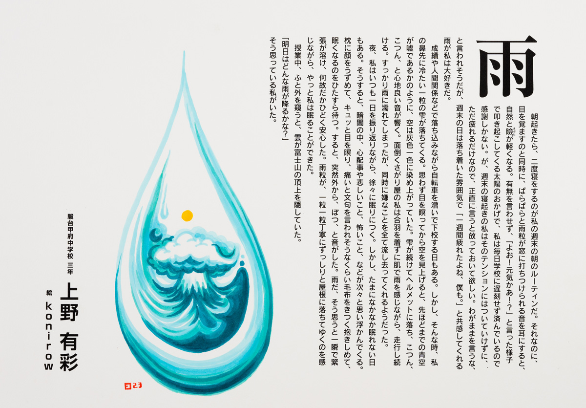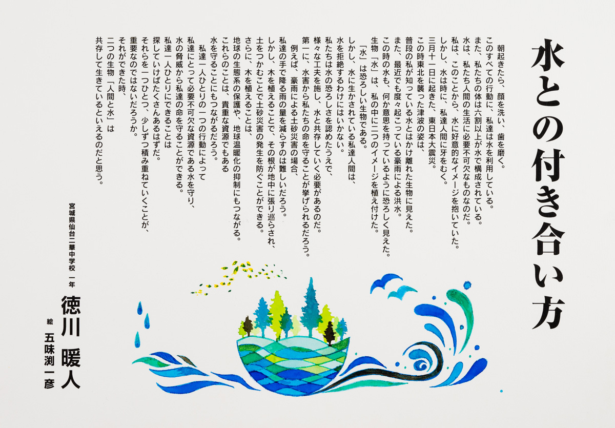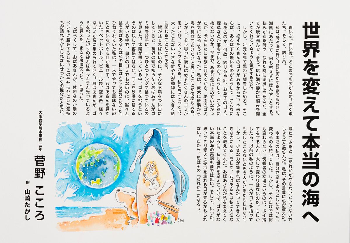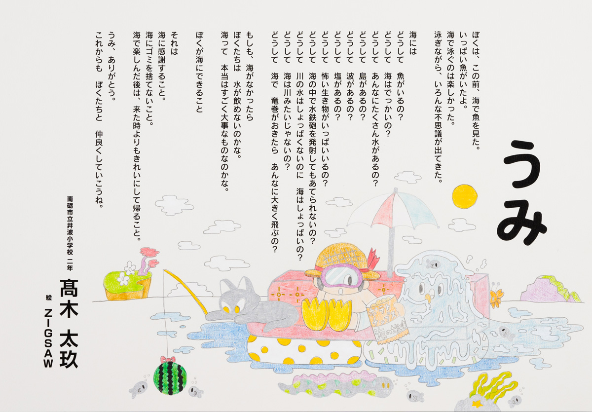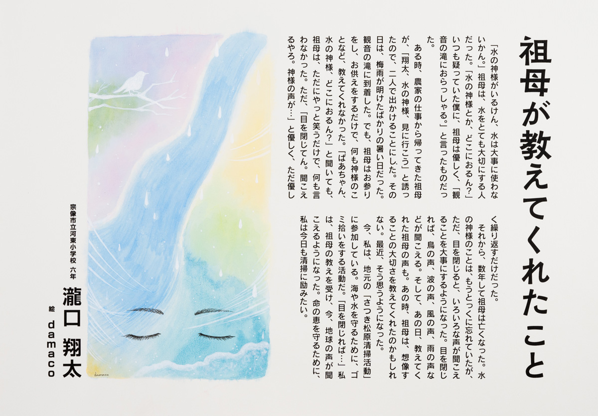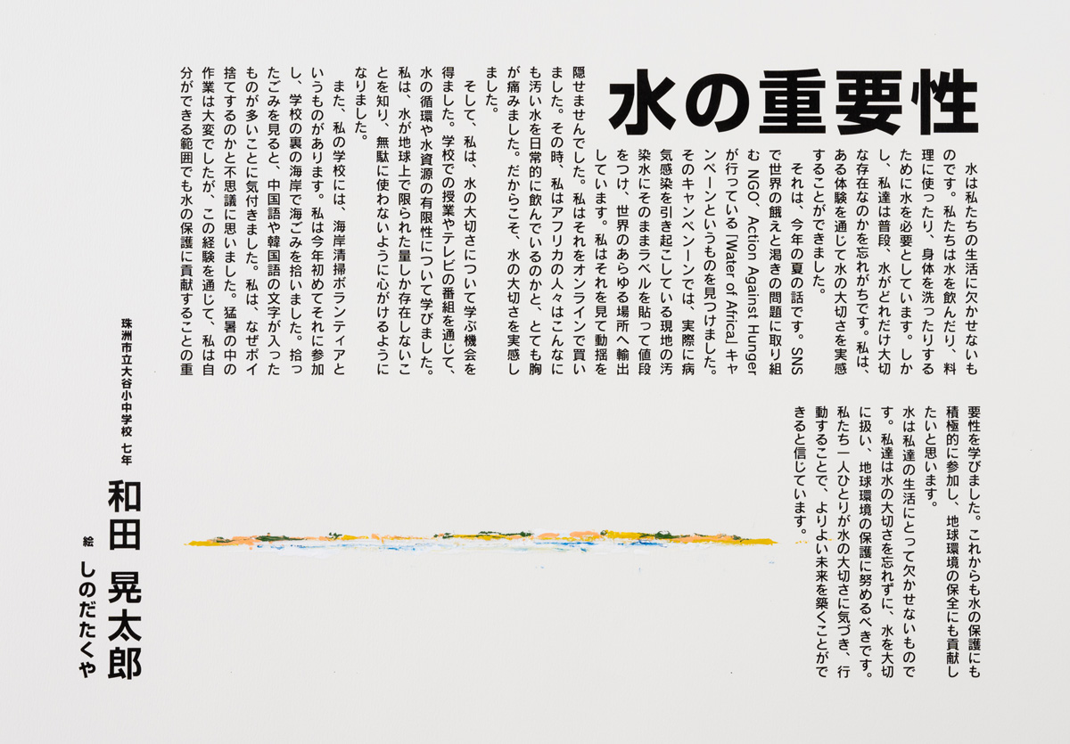 AWARD ざぶん賞 受賞作品 第21回(2023年度) ざぶん賞 受賞作品 大賞 ざぶん大賞 「おじいちゃんの雨」 海老原大輝 (真岡市立真岡小学校2年) 絵:西のぼる 大臣賞・長官賞・地方自治体特別賞 国土交通大臣賞 「空から見た海」 内田優陽 (市貝町立市貝小学校5年) 絵:市村淳一 文部科学大臣賞/審査委員長賞 「祖母が教えてくれたこと」 瀧口翔太 (宗像市立河東小学校6年) 絵:damaco 環境大臣賞 「災害と対策、自分のできること」 杉本蒼 (葛尾中学校1年) 絵:百鬼丸 海上保安庁長官賞 「うみ」 髙木太玖 (南砺市立井波小学校2年) 絵:ZIGSAW 水産庁長官賞 「想いを繋ぐ宝石箱」 田渕聖依 (滝川学園滝川第二中学校3年) 絵:konirow 審査委員長特別賞・準大賞 準大賞 「世界を変えて本当の海へ」 菅野こころ (大阪女学院中学校3年) 絵:山崎たかし 準大賞 「飛び込んだ」 角瑛斗 (八女市立八幡小学校4年) 絵:高橋汽章 準大賞 「引き継ぎたいこの味」 岩城心結 (西条市立西条南中学校2年) 絵:ほんだじょり 準大賞 「できるようになったよ」 若松侑莉亜 (さつま町立佐志小学校4年) 絵:一二明子 ざぶん環境賞・ざぶん文化賞 ざぶん文化賞 「おふろ」 出村慈雨 (宇都宮市立城山西小学校4年) 絵:市村淳一 ざぶん文化賞 「水人間」 鵜飼一有 (姫路市立旭陽小学校2年) 絵:ZIGSAW ざぶん文化賞 「水は宝物」 小島あかり (宇都宮市立城山西小学校6年) 絵:さぶさちえ ざぶん文化賞 「はしれボート」 米倉櫂世 (さつま町立佐志小学校1年) 絵:ホシガミヤ・小林 ざぶん文化賞 「目の前の川を見て思う、自由とは」 五味愛琳 (ソウル日本人中学校3年) 絵:一瀬美那子 ざぶん文化賞 「雨」 上野有彩 (駿台甲府中学校3年) 絵:konirow ざぶん文化賞 「水と僕」 髙木晴琉 (南砺市立井波小学校4年) 絵:梅村万里子 ざぶん文化賞 「にじ色の未来」 小礒道允 (開智望小学校3年) 絵:キクチユウタ ざぶん文化賞 「うみのやどかりとかに」 君塚結花 (川崎市立宮内小学校1年) 絵:矢野公子 ざぶん文化賞 「がんばった水えい大会」 宮崎結葵 (さつま町立佐志小学校2年) 絵:ふくおかひとみ ざぶん環境賞 「水面が繋ぐ昔と今」 三澤茜 (駿台甲府中学校1年) 絵:百鬼丸 ざぶん環境賞 「海にあった消化器」 田中優助 (平塚市立旭陵中学校3年) 絵:ほんだじょり ざぶん環境賞 「地球が悲鳴をあげている。未来の私が問いかける。」 管野未悠 (国見町立県北中学校3年) 絵:高橋汽章 ざぶん環境賞 「身近に迫った水害」 万代百恵 (岡山県立津山中学校2年) 絵:KEN★16 ざぶん環境賞 「水の重要性」 和田晃太郎 (珠洲市立大谷小中学校7年) 絵:しのだたくや ざぶん環境賞 「生活の水」 橋川駿 (渋谷教育学園渋谷中学校1年) 絵:キクチユウ ざぶん環境賞 「アップデートと共に守るもの」 中間正 (東京都世田谷区立三宿中学校2年) 絵:原田リカ ざぶん環境賞 「水との付き合い方」 徳川暖人 (宮城県仙台二華中学校1年) 絵:五味渕一彦 ざぶん環境賞 「みず」 石井杏奈 (目黒学院中学校1年) 絵:さとうてるみ ざぶん環境賞 「生命の水」 高根沢綸 (大田原市立野崎中学校3年) 絵:松江比佐子 ざぶん賞招待 ざぶん賞招待 「湖」 野澤匠誠 (栃木県立聾学校 中学部1年) 絵:市村淳一 ざぶん賞招待 「にじ色の水ととうめいの水と茶色の水」 伊東洵輝 (広島県立廿日市特別支援学校6年) 絵:miiya