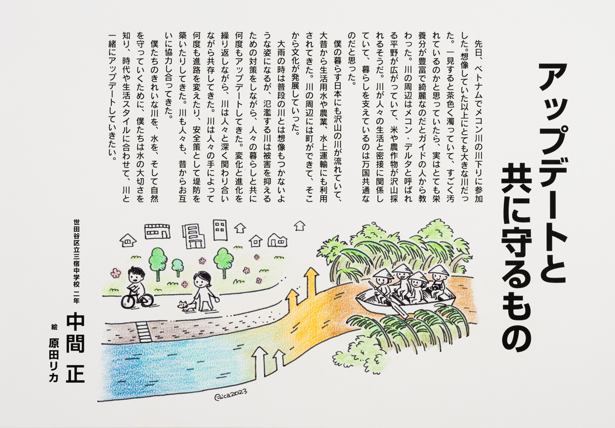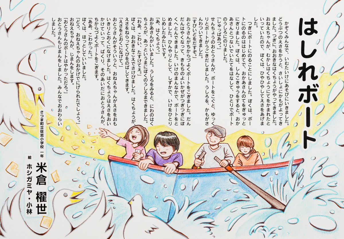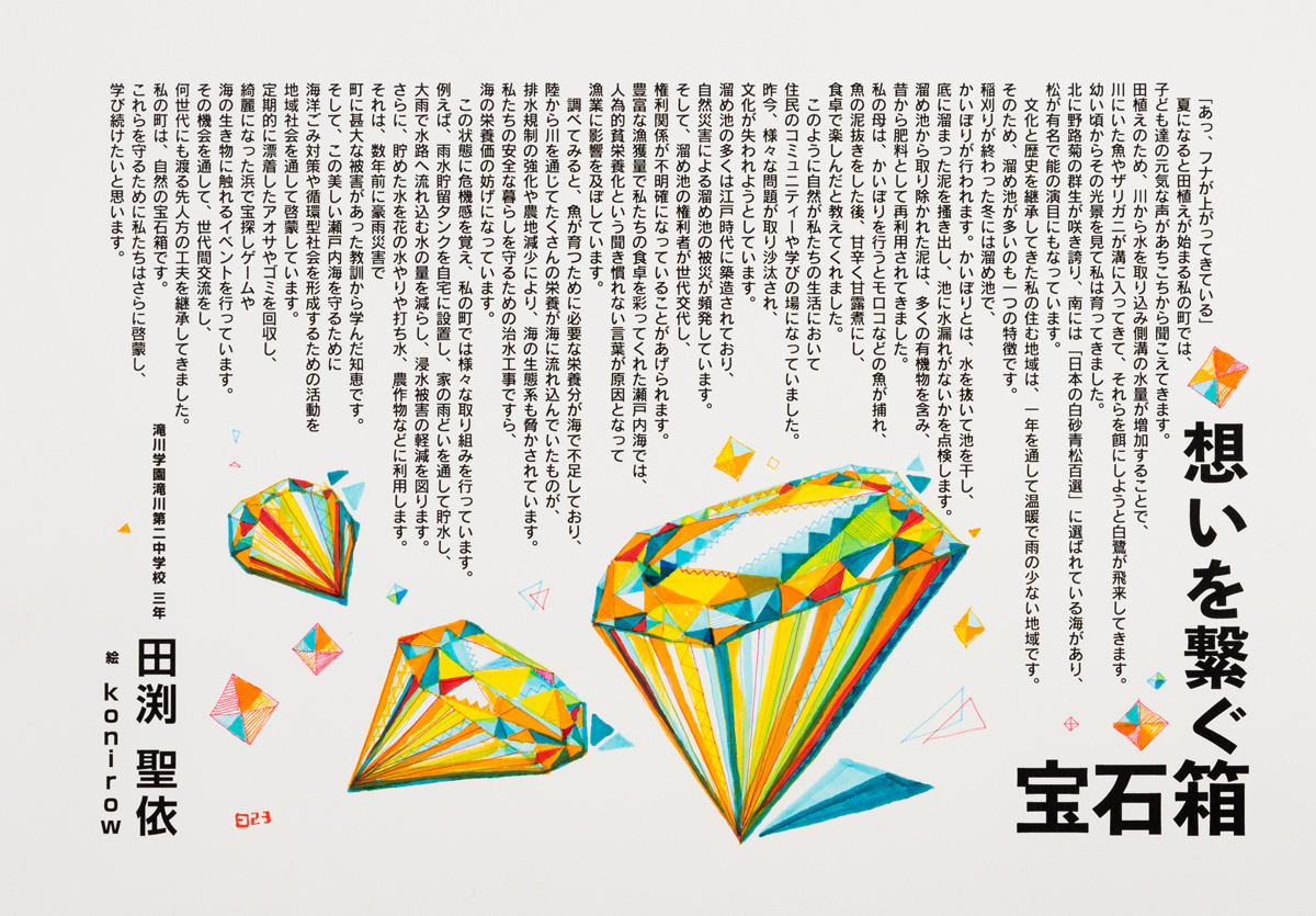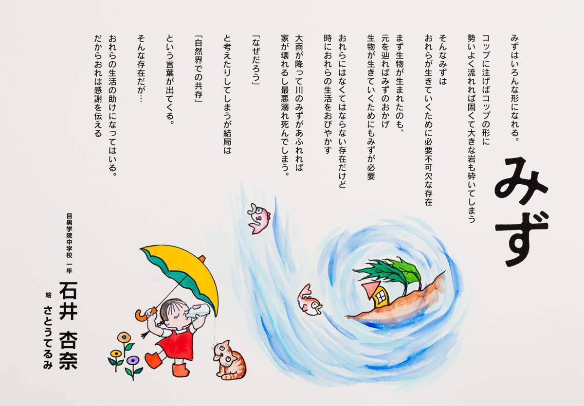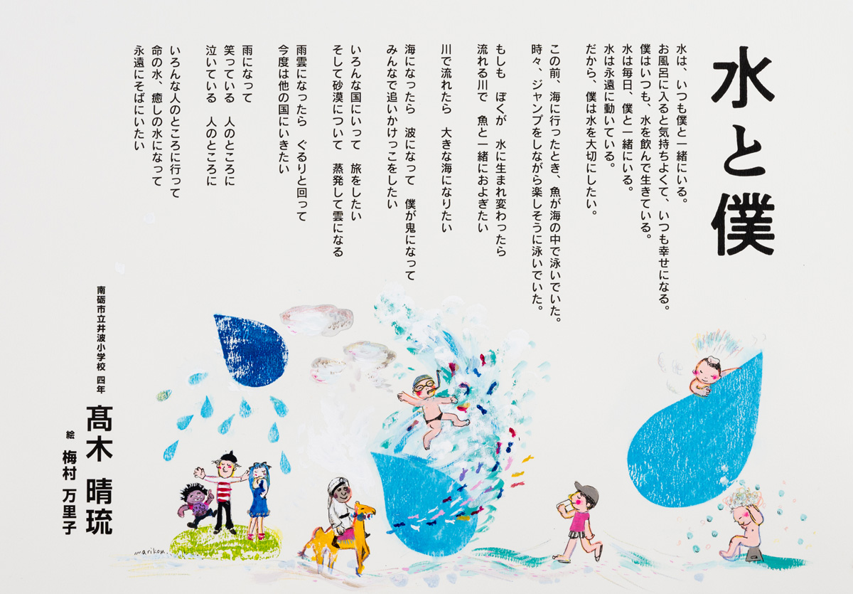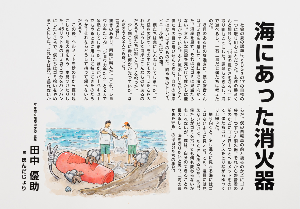 AWARD ざぶん賞 受賞作品 第21回(2023年度) ざぶん賞 受賞作品 大賞 ざぶん大賞 「おじいちゃんの雨」 海老原大輝 (真岡市立真岡小学校2年) 絵:西のぼる 大臣賞・長官賞・地方自治体特別賞 国土交通大臣賞 「空から見た海」 内田優陽 (市貝町立市貝小学校5年) 絵:市村淳一 文部科学大臣賞/審査委員長賞 「祖母が教えてくれたこと」 瀧口翔太 (宗像市立河東小学校6年) 絵:damaco 環境大臣賞 「災害と対策、自分のできること」 杉本蒼 (葛尾中学校1年) 絵:百鬼丸 海上保安庁長官賞 「うみ」 髙木太玖 (南砺市立井波小学校2年) 絵:ZIGSAW 水産庁長官賞 「想いを繋ぐ宝石箱」 田渕聖依 (滝川学園滝川第二中学校3年) 絵:konirow 審査委員長特別賞・準大賞 準大賞 「世界を変えて本当の海へ」 菅野こころ (大阪女学院中学校3年) 絵:山崎たかし 準大賞 「飛び込んだ」 角瑛斗 (八女市立八幡小学校4年) 絵:高橋汽章 準大賞 「引き継ぎたいこの味」 岩城心結 (西条市立西条南中学校2年) 絵:ほんだじょり 準大賞 「できるようになったよ」 若松侑莉亜 (さつま町立佐志小学校4年) 絵:一二明子 ざぶん環境賞・ざぶん文化賞 ざぶん文化賞 「おふろ」 出村慈雨 (宇都宮市立城山西小学校4年) 絵:市村淳一 ざぶん文化賞 「水人間」 鵜飼一有 (姫路市立旭陽小学校2年) 絵:ZIGSAW ざぶん文化賞 「水は宝物」 小島あかり (宇都宮市立城山西小学校6年) 絵:さぶさちえ ざぶん文化賞 「はしれボート」 米倉櫂世 (さつま町立佐志小学校1年) 絵:ホシガミヤ・小林 ざぶん文化賞 「目の前の川を見て思う、自由とは」 五味愛琳 (ソウル日本人中学校3年) 絵:一瀬美那子 ざぶん文化賞 「雨」 上野有彩 (駿台甲府中学校3年) 絵:konirow ざぶん文化賞 「水と僕」 髙木晴琉 (南砺市立井波小学校4年) 絵:梅村万里子 ざぶん文化賞 「にじ色の未来」 小礒道允 (開智望小学校3年) 絵:キクチユウタ ざぶん文化賞 「うみのやどかりとかに」 君塚結花 (川崎市立宮内小学校1年) 絵:矢野公子 ざぶん文化賞 「がんばった水えい大会」 宮崎結葵 (さつま町立佐志小学校2年) 絵:ふくおかひとみ ざぶん環境賞 「水面が繋ぐ昔と今」 三澤茜 (駿台甲府中学校1年) 絵:百鬼丸 ざぶん環境賞 「海にあった消化器」 田中優助 (平塚市立旭陵中学校3年) 絵:ほんだじょり ざぶん環境賞 「地球が悲鳴をあげている。未来の私が問いかける。」 管野未悠 (国見町立県北中学校3年) 絵:高橋汽章 ざぶん環境賞 「身近に迫った水害」 万代百恵 (岡山県立津山中学校2年) 絵:KEN★16 ざぶん環境賞 「水の重要性」 和田晃太郎 (珠洲市立大谷小中学校7年) 絵:しのだたくや ざぶん環境賞 「生活の水」 橋川駿 (渋谷教育学園渋谷中学校1年) 絵:キクチユウ ざぶん環境賞 「アップデートと共に守るもの」 中間正 (東京都世田谷区立三宿中学校2年) 絵:原田リカ ざぶん環境賞 「水との付き合い方」 徳川暖人 (宮城県仙台二華中学校1年) 絵:五味渕一彦 ざぶん環境賞 「みず」 石井杏奈 (目黒学院中学校1年) 絵:さとうてるみ ざぶん環境賞 「生命の水」 高根沢綸 (大田原市立野崎中学校3年) 絵:松江比佐子 ざぶん賞招待 ざぶん賞招待 「湖」 野澤匠誠 (栃木県立聾学校 中学部1年) 絵:市村淳一 ざぶん賞招待 「にじ色の水ととうめいの水と茶色の水」 伊東洵輝 (広島県立廿日市特別支援学校6年) 絵:miiya