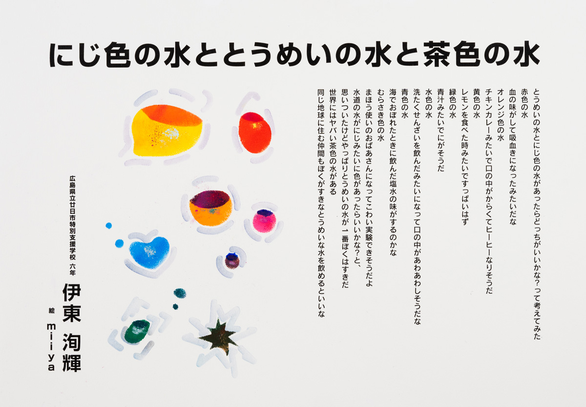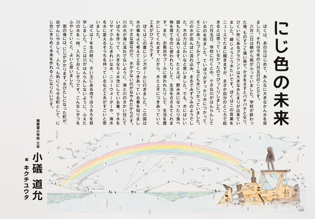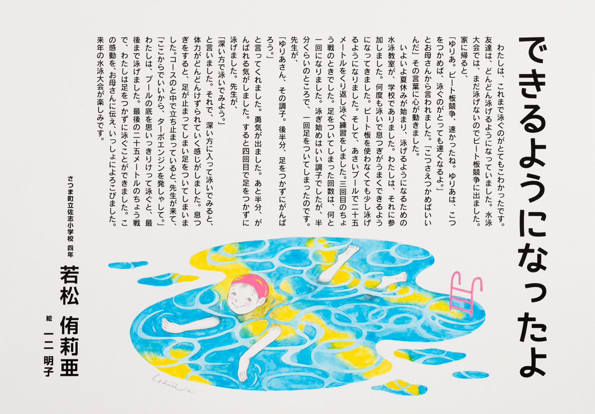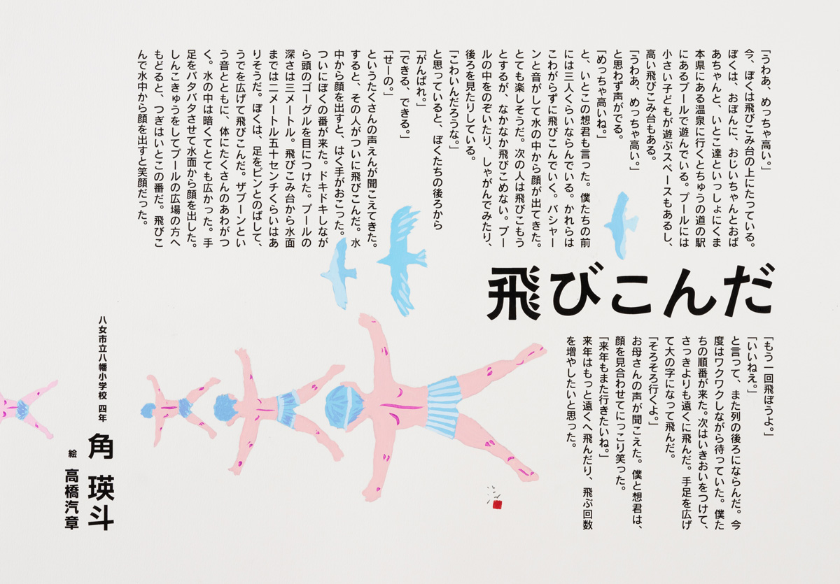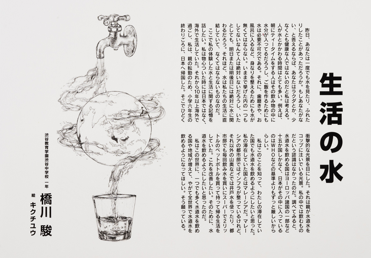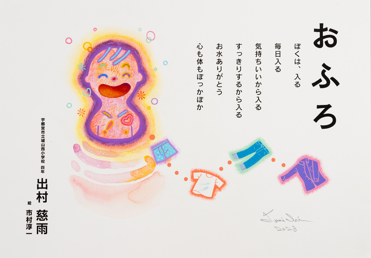 AWARD ざぶん賞 受賞作品 第21回(2023年度) ざぶん賞 受賞作品 大賞 ざぶん大賞 「おじいちゃんの雨」 海老原大輝 (真岡市立真岡小学校2年) 絵:西のぼる 大臣賞・長官賞・地方自治体特別賞 国土交通大臣賞 「空から見た海」 内田優陽 (市貝町立市貝小学校5年) 絵:市村淳一 文部科学大臣賞/審査委員長賞 「祖母が教えてくれたこと」 瀧口翔太 (宗像市立河東小学校6年) 絵:damaco 環境大臣賞 「災害と対策、自分のできること」 杉本蒼 (葛尾中学校1年) 絵:百鬼丸 海上保安庁長官賞 「うみ」 髙木太玖 (南砺市立井波小学校2年) 絵:ZIGSAW 水産庁長官賞 「想いを繋ぐ宝石箱」 田渕聖依 (滝川学園滝川第二中学校3年) 絵:konirow 審査委員長特別賞・準大賞 準大賞 「世界を変えて本当の海へ」 菅野こころ (大阪女学院中学校3年) 絵:山崎たかし 準大賞 「飛び込んだ」 角瑛斗 (八女市立八幡小学校4年) 絵:高橋汽章 準大賞 「引き継ぎたいこの味」 岩城心結 (西条市立西条南中学校2年) 絵:ほんだじょり 準大賞 「できるようになったよ」 若松侑莉亜 (さつま町立佐志小学校4年) 絵:一二明子 ざぶん環境賞・ざぶん文化賞 ざぶん文化賞 「おふろ」 出村慈雨 (宇都宮市立城山西小学校4年) 絵:市村淳一 ざぶん文化賞 「水人間」 鵜飼一有 (姫路市立旭陽小学校2年) 絵:ZIGSAW ざぶん文化賞 「水は宝物」 小島あかり (宇都宮市立城山西小学校6年) 絵:さぶさちえ ざぶん文化賞 「はしれボート」 米倉櫂世 (さつま町立佐志小学校1年) 絵:ホシガミヤ・小林 ざぶん文化賞 「目の前の川を見て思う、自由とは」 五味愛琳 (ソウル日本人中学校3年) 絵:一瀬美那子 ざぶん文化賞 「雨」 上野有彩 (駿台甲府中学校3年) 絵:konirow ざぶん文化賞 「水と僕」 髙木晴琉 (南砺市立井波小学校4年) 絵:梅村万里子 ざぶん文化賞 「にじ色の未来」 小礒道允 (開智望小学校3年) 絵:キクチユウタ ざぶん文化賞 「うみのやどかりとかに」 君塚結花 (川崎市立宮内小学校1年) 絵:矢野公子 ざぶん文化賞 「がんばった水えい大会」 宮崎結葵 (さつま町立佐志小学校2年) 絵:ふくおかひとみ ざぶん環境賞 「水面が繋ぐ昔と今」 三澤茜 (駿台甲府中学校1年) 絵:百鬼丸 ざぶん環境賞 「海にあった消化器」 田中優助 (平塚市立旭陵中学校3年) 絵:ほんだじょり ざぶん環境賞 「地球が悲鳴をあげている。未来の私が問いかける。」 管野未悠 (国見町立県北中学校3年) 絵:高橋汽章 ざぶん環境賞 「身近に迫った水害」 万代百恵 (岡山県立津山中学校2年) 絵:KEN★16 ざぶん環境賞 「水の重要性」 和田晃太郎 (珠洲市立大谷小中学校7年) 絵:しのだたくや ざぶん環境賞 「生活の水」 橋川駿 (渋谷教育学園渋谷中学校1年) 絵:キクチユウ ざぶん環境賞 「アップデートと共に守るもの」 中間正 (東京都世田谷区立三宿中学校2年) 絵:原田リカ ざぶん環境賞 「水との付き合い方」 徳川暖人 (宮城県仙台二華中学校1年) 絵:五味渕一彦 ざぶん環境賞 「みず」 石井杏奈 (目黒学院中学校1年) 絵:さとうてるみ ざぶん環境賞 「生命の水」 高根沢綸 (大田原市立野崎中学校3年) 絵:松江比佐子 ざぶん賞招待 ざぶん賞招待 「湖」 野澤匠誠 (栃木県立聾学校 中学部1年) 絵:市村淳一 ざぶん賞招待 「にじ色の水ととうめいの水と茶色の水」 伊東洵輝 (広島県立廿日市特別支援学校6年) 絵:miiya