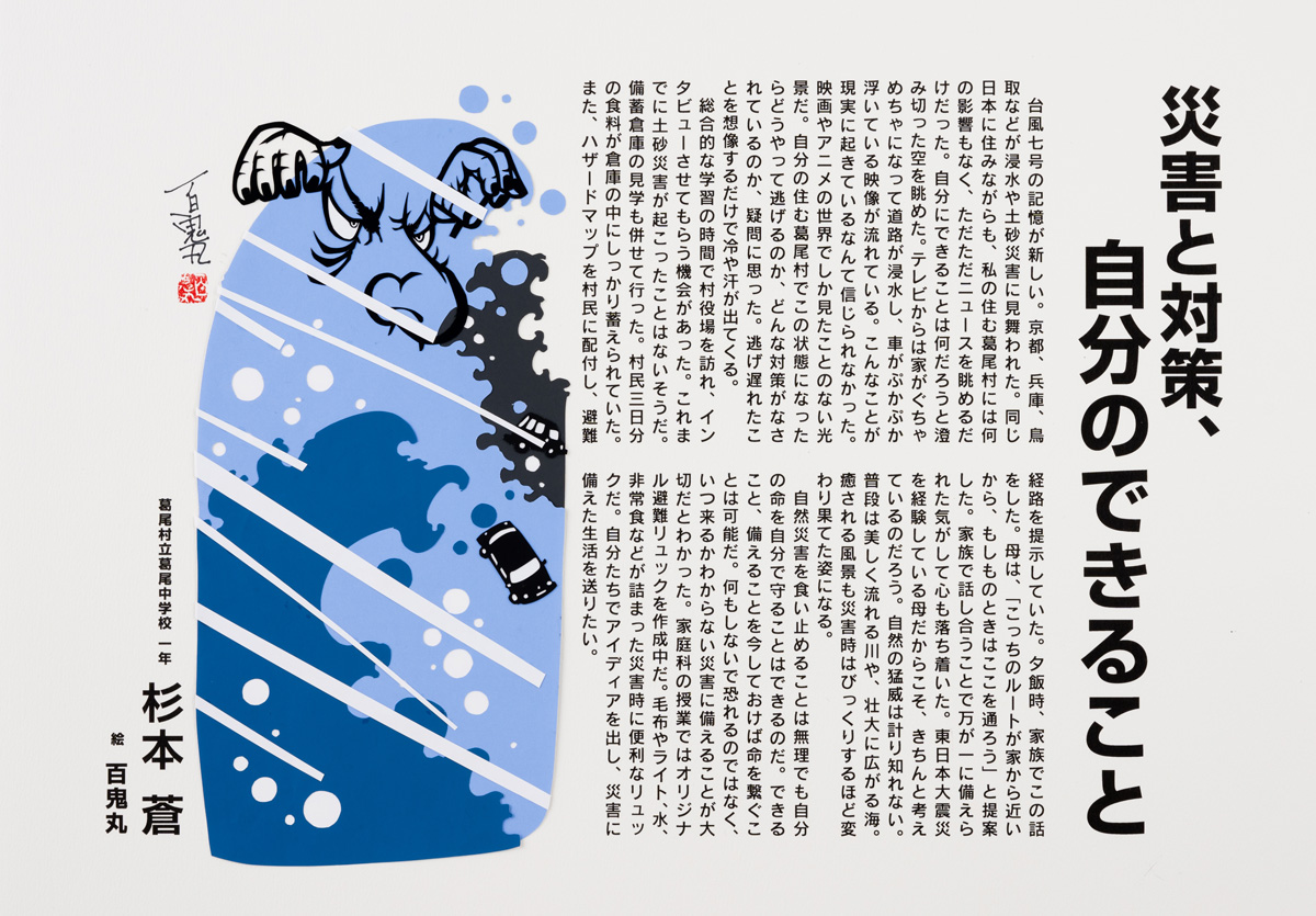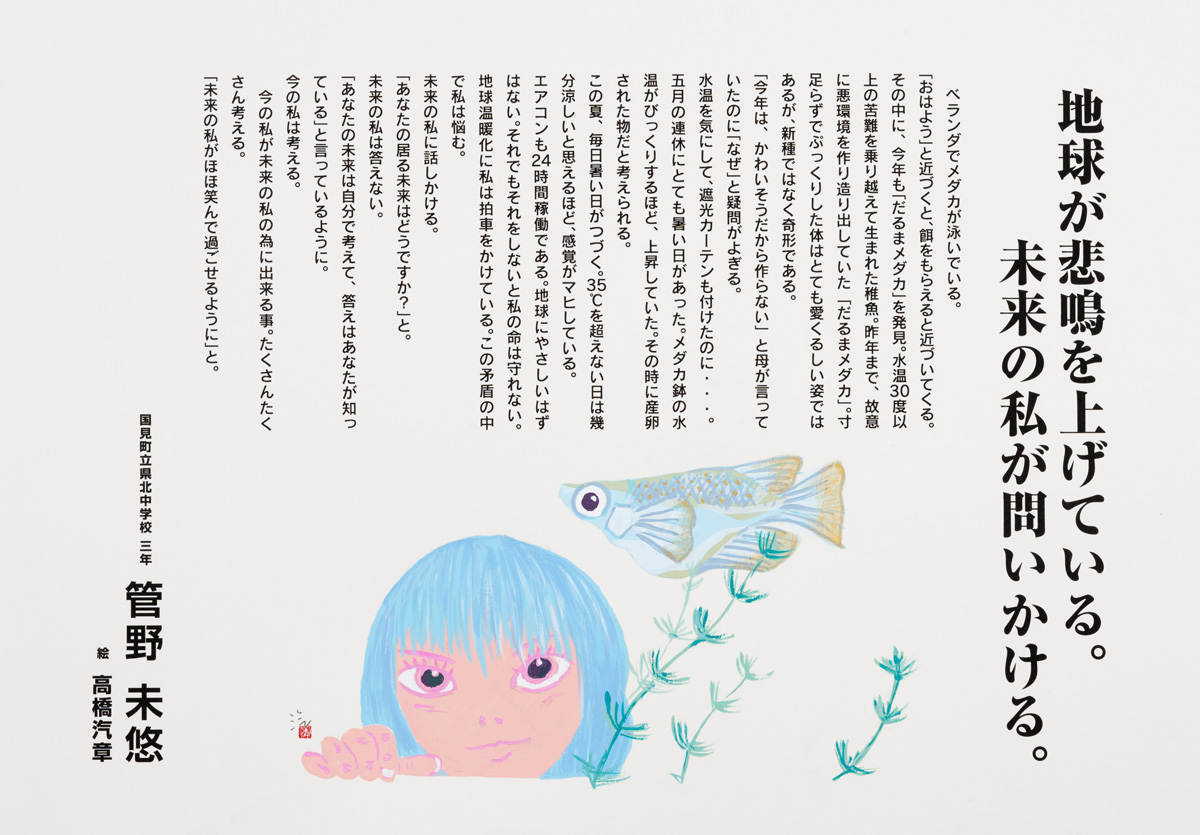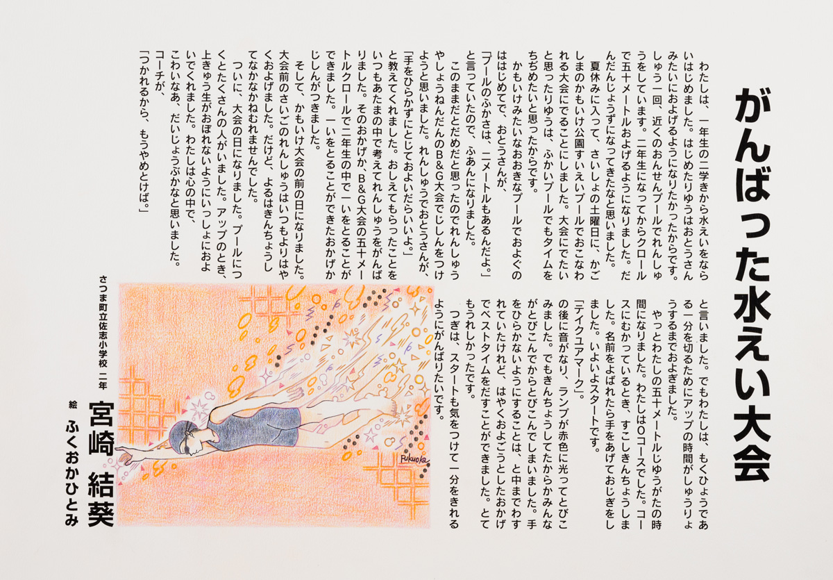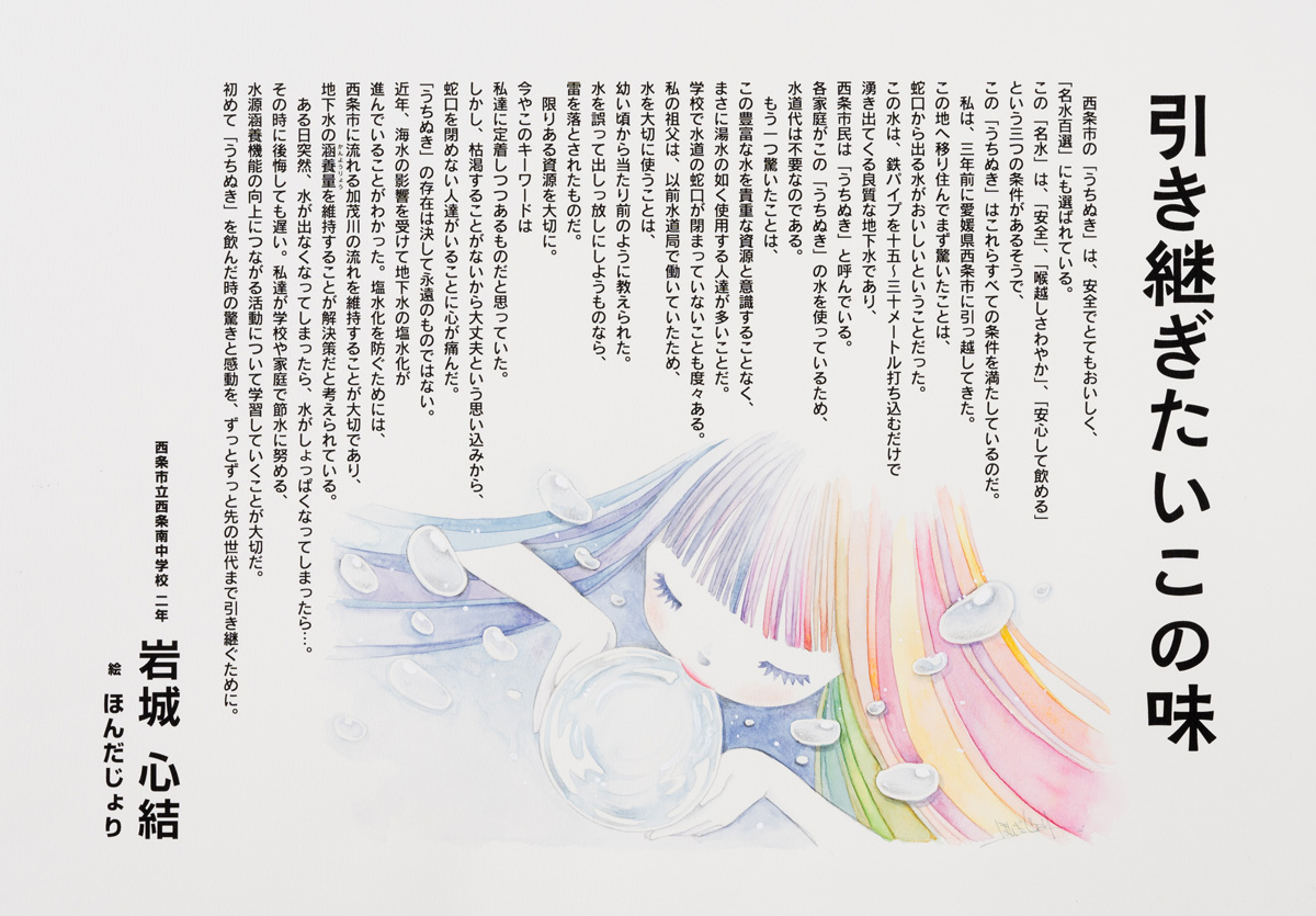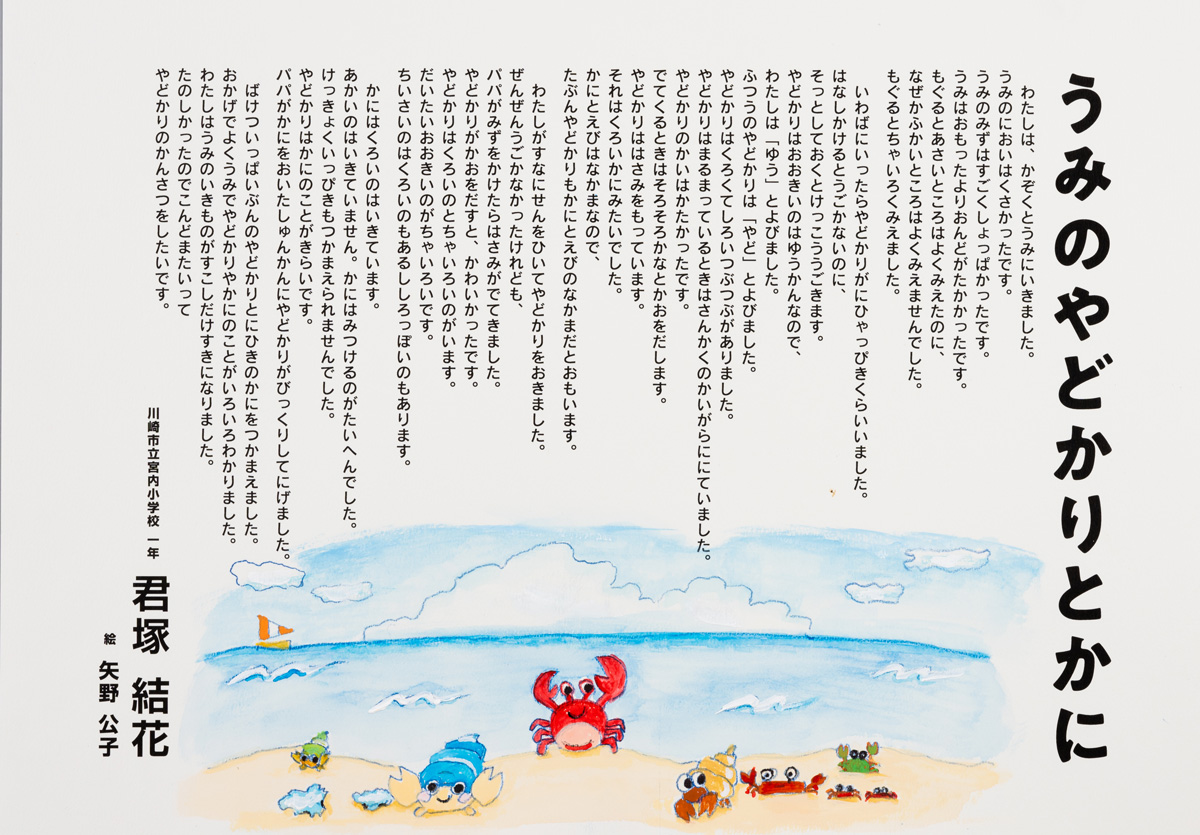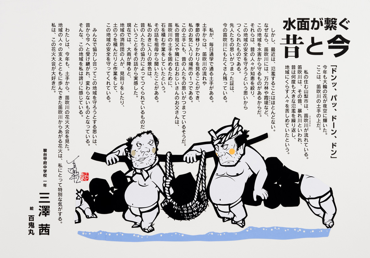 AWARD ざぶん賞 受賞作品 第21回(2023年度) ざぶん賞 受賞作品 大賞 ざぶん大賞 「おじいちゃんの雨」 海老原大輝 (真岡市立真岡小学校2年) 絵:西のぼる 大臣賞・長官賞・地方自治体特別賞 国土交通大臣賞 「空から見た海」 内田優陽 (市貝町立市貝小学校5年) 絵:市村淳一 文部科学大臣賞/審査委員長賞 「祖母が教えてくれたこと」 瀧口翔太 (宗像市立河東小学校6年) 絵:damaco 環境大臣賞 「災害と対策、自分のできること」 杉本蒼 (葛尾中学校1年) 絵:百鬼丸 海上保安庁長官賞 「うみ」 髙木太玖 (南砺市立井波小学校2年) 絵:ZIGSAW 水産庁長官賞 「想いを繋ぐ宝石箱」 田渕聖依 (滝川学園滝川第二中学校3年) 絵:konirow 審査委員長特別賞・準大賞 準大賞 「世界を変えて本当の海へ」 菅野こころ (大阪女学院中学校3年) 絵:山崎たかし 準大賞 「飛び込んだ」 角瑛斗 (八女市立八幡小学校4年) 絵:高橋汽章 準大賞 「引き継ぎたいこの味」 岩城心結 (西条市立西条南中学校2年) 絵:ほんだじょり 準大賞 「できるようになったよ」 若松侑莉亜 (さつま町立佐志小学校4年) 絵:一二明子 ざぶん環境賞・ざぶん文化賞 ざぶん文化賞 「おふろ」 出村慈雨 (宇都宮市立城山西小学校4年) 絵:市村淳一 ざぶん文化賞 「水人間」 鵜飼一有 (姫路市立旭陽小学校2年) 絵:ZIGSAW ざぶん文化賞 「水は宝物」 小島あかり (宇都宮市立城山西小学校6年) 絵:さぶさちえ ざぶん文化賞 「はしれボート」 米倉櫂世 (さつま町立佐志小学校1年) 絵:ホシガミヤ・小林 ざぶん文化賞 「目の前の川を見て思う、自由とは」 五味愛琳 (ソウル日本人中学校3年) 絵:一瀬美那子 ざぶん文化賞 「雨」 上野有彩 (駿台甲府中学校3年) 絵:konirow ざぶん文化賞 「水と僕」 髙木晴琉 (南砺市立井波小学校4年) 絵:梅村万里子 ざぶん文化賞 「にじ色の未来」 小礒道允 (開智望小学校3年) 絵:キクチユウタ ざぶん文化賞 「うみのやどかりとかに」 君塚結花 (川崎市立宮内小学校1年) 絵:矢野公子 ざぶん文化賞 「がんばった水えい大会」 宮崎結葵 (さつま町立佐志小学校2年) 絵:ふくおかひとみ ざぶん環境賞 「水面が繋ぐ昔と今」 三澤茜 (駿台甲府中学校1年) 絵:百鬼丸 ざぶん環境賞 「海にあった消化器」 田中優助 (平塚市立旭陵中学校3年) 絵:ほんだじょり ざぶん環境賞 「地球が悲鳴をあげている。未来の私が問いかける。」 管野未悠 (国見町立県北中学校3年) 絵:高橋汽章 ざぶん環境賞 「身近に迫った水害」 万代百恵 (岡山県立津山中学校2年) 絵:KEN★16 ざぶん環境賞 「水の重要性」 和田晃太郎 (珠洲市立大谷小中学校7年) 絵:しのだたくや ざぶん環境賞 「生活の水」 橋川駿 (渋谷教育学園渋谷中学校1年) 絵:キクチユウ ざぶん環境賞 「アップデートと共に守るもの」 中間正 (東京都世田谷区立三宿中学校2年) 絵:原田リカ ざぶん環境賞 「水との付き合い方」 徳川暖人 (宮城県仙台二華中学校1年) 絵:五味渕一彦 ざぶん環境賞 「みず」 石井杏奈 (目黒学院中学校1年) 絵:さとうてるみ ざぶん環境賞 「生命の水」 高根沢綸 (大田原市立野崎中学校3年) 絵:松江比佐子 ざぶん賞招待 ざぶん賞招待 「湖」 野澤匠誠 (栃木県立聾学校 中学部1年) 絵:市村淳一 ざぶん賞招待 「にじ色の水ととうめいの水と茶色の水」 伊東洵輝 (広島県立廿日市特別支援学校6年) 絵:miiya
